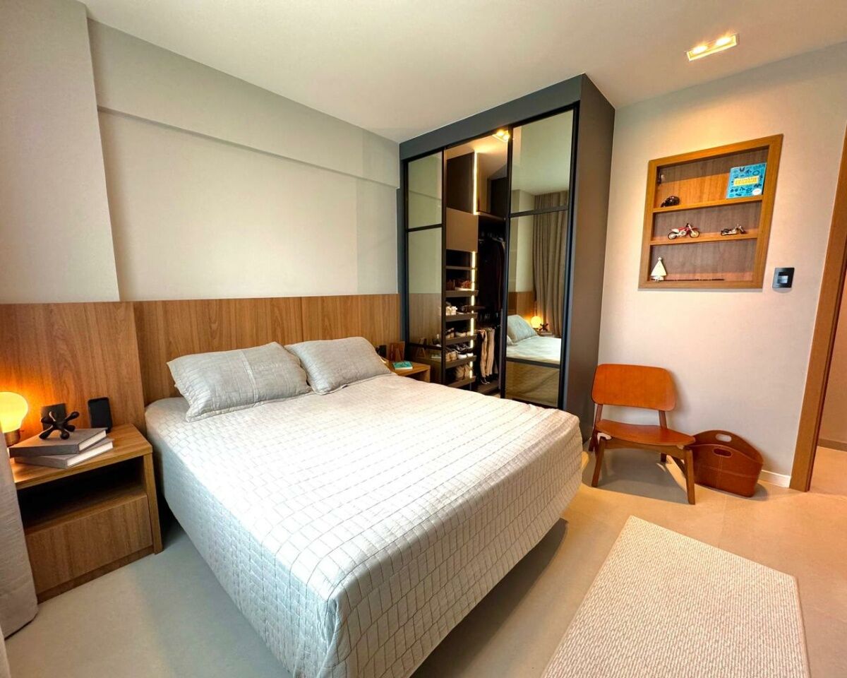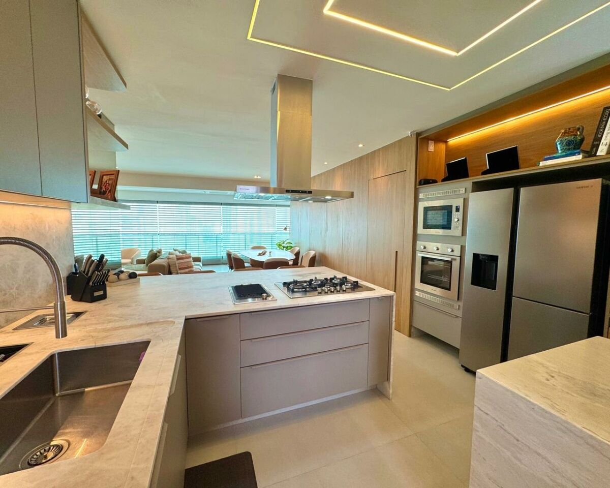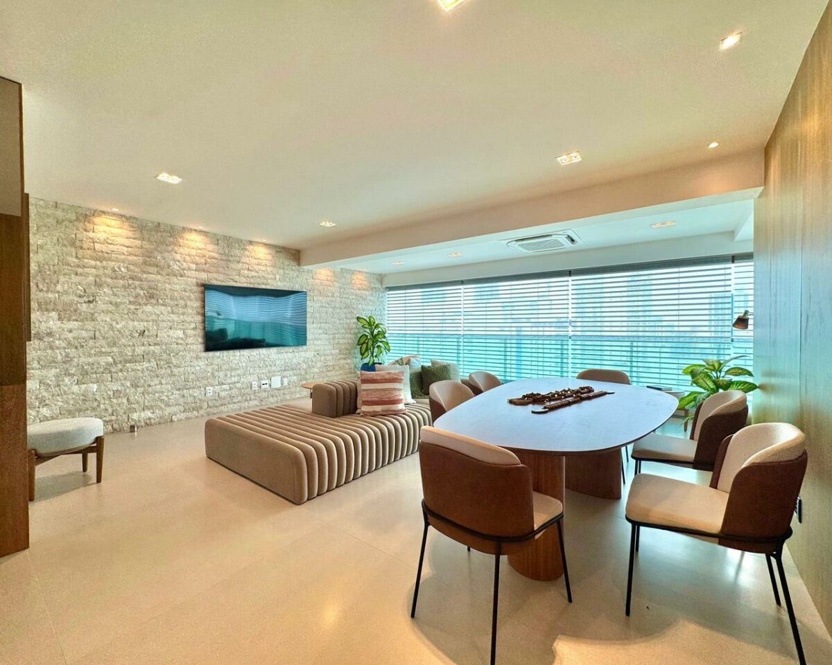 Excelente apartamento, nascente, porteira fechada, vista mar, finamente decorado, de 105m², com 2 quartos, 2 suítes, piso frio, varanda incorporada com fechamento em reiki, dining room, living room, lavabo, armários planejados em todos os cômodos, ambientes climatizados, cozinha espaçosa em conceito aberto, móveis e decoração escolhidos por designers, área de serviço com banheiro, projeto de iluminação, e duvas vagas de garagem.