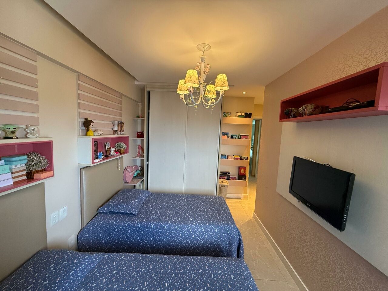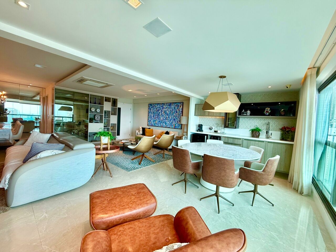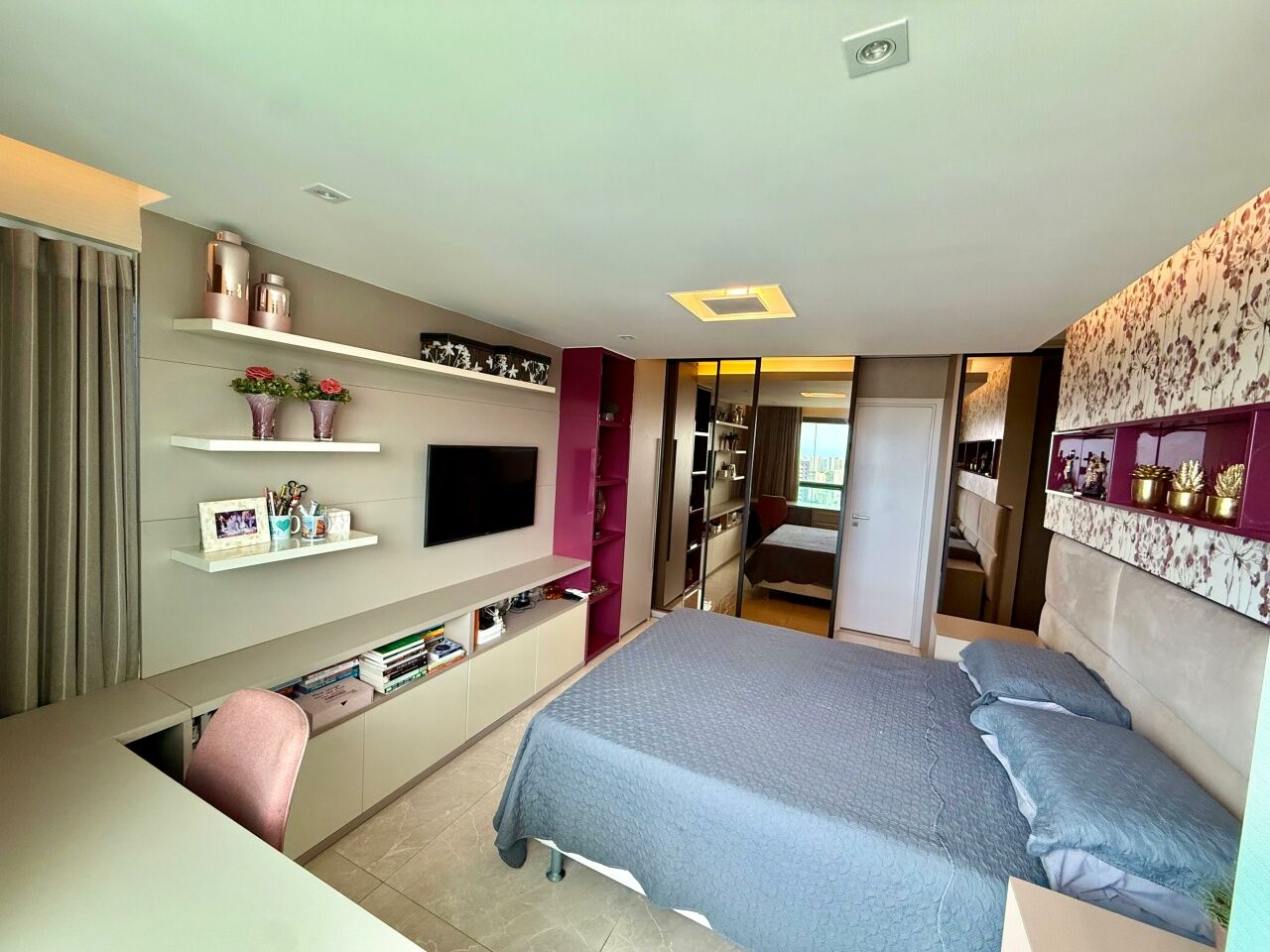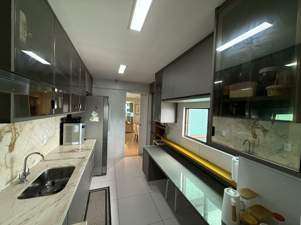 Excelente apartamento, porteira fechada, nascente, fino acabamento, de 162m², com 3 quartos, 3 suítes, piso em porcelanato, home office, varanda goumet incoporada com fechamento em reiki, sala de jantar, sala de estar, lavabo, armários planejados em todos os cômodos, projeto de iluminação, rebaixamento em gesso, cozinha espaçosa, área de serviço, vista mar, andar alto, e três vagas de garagem.