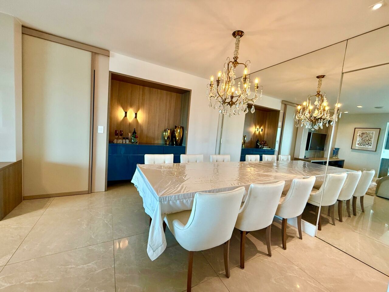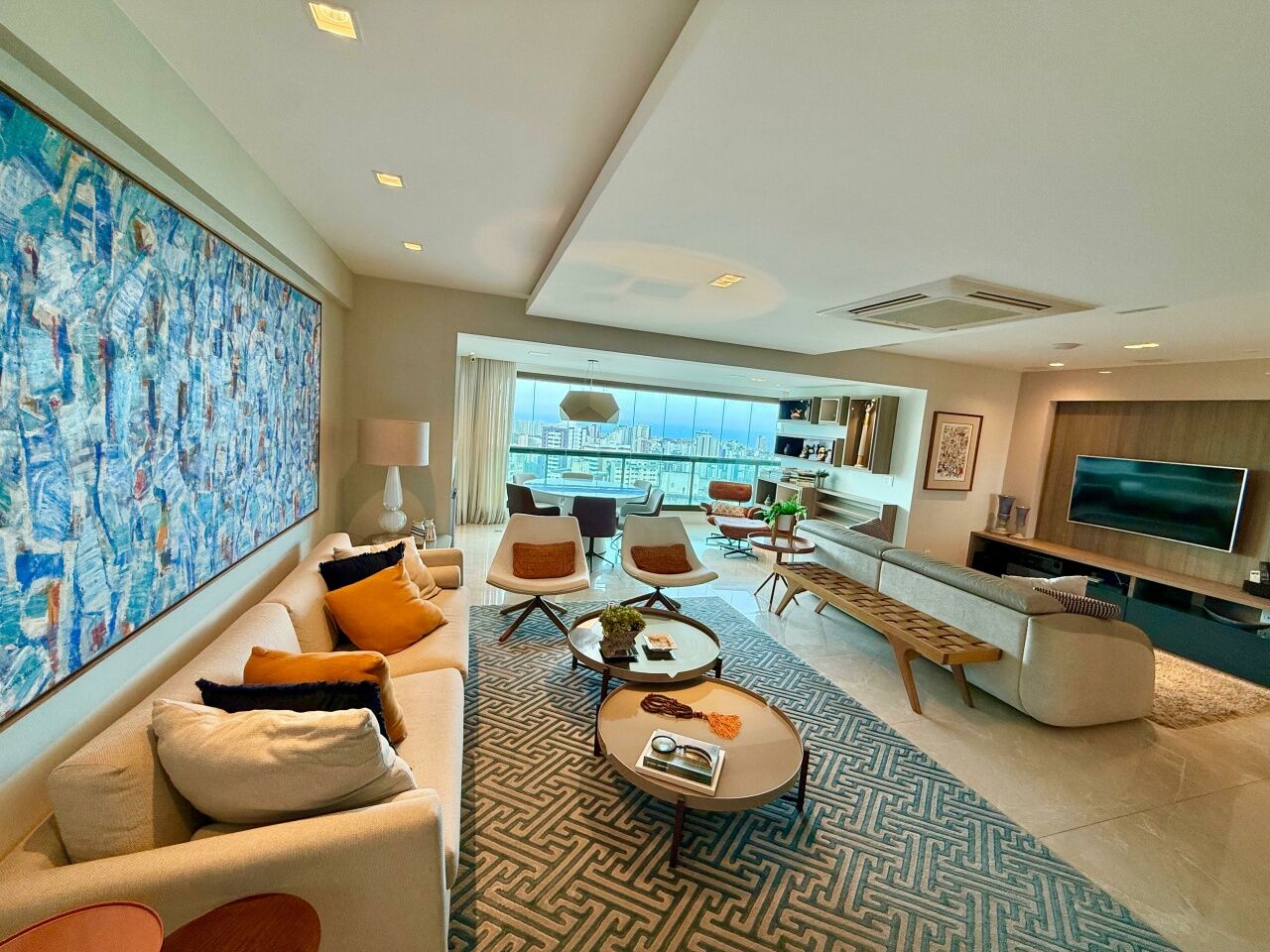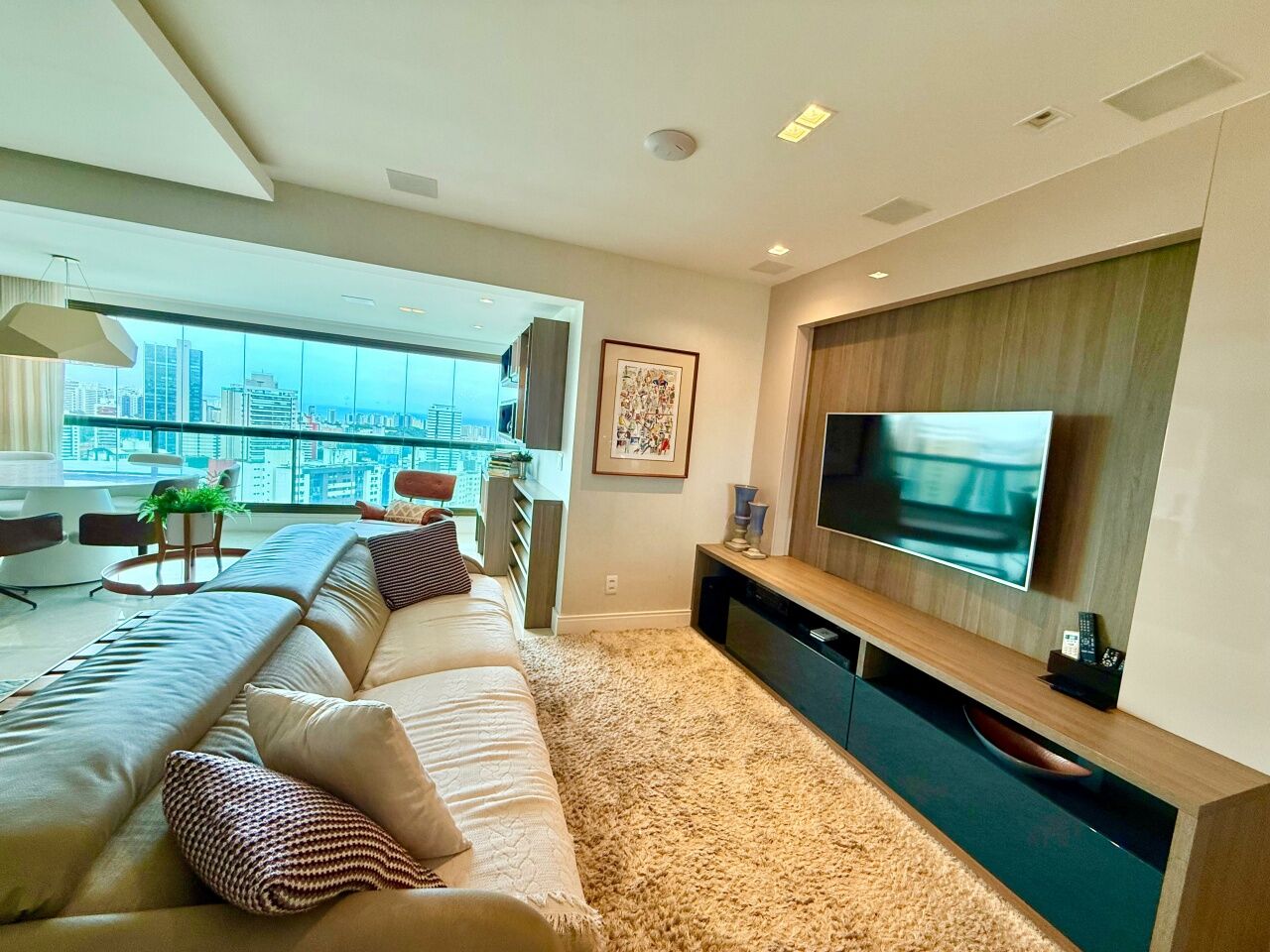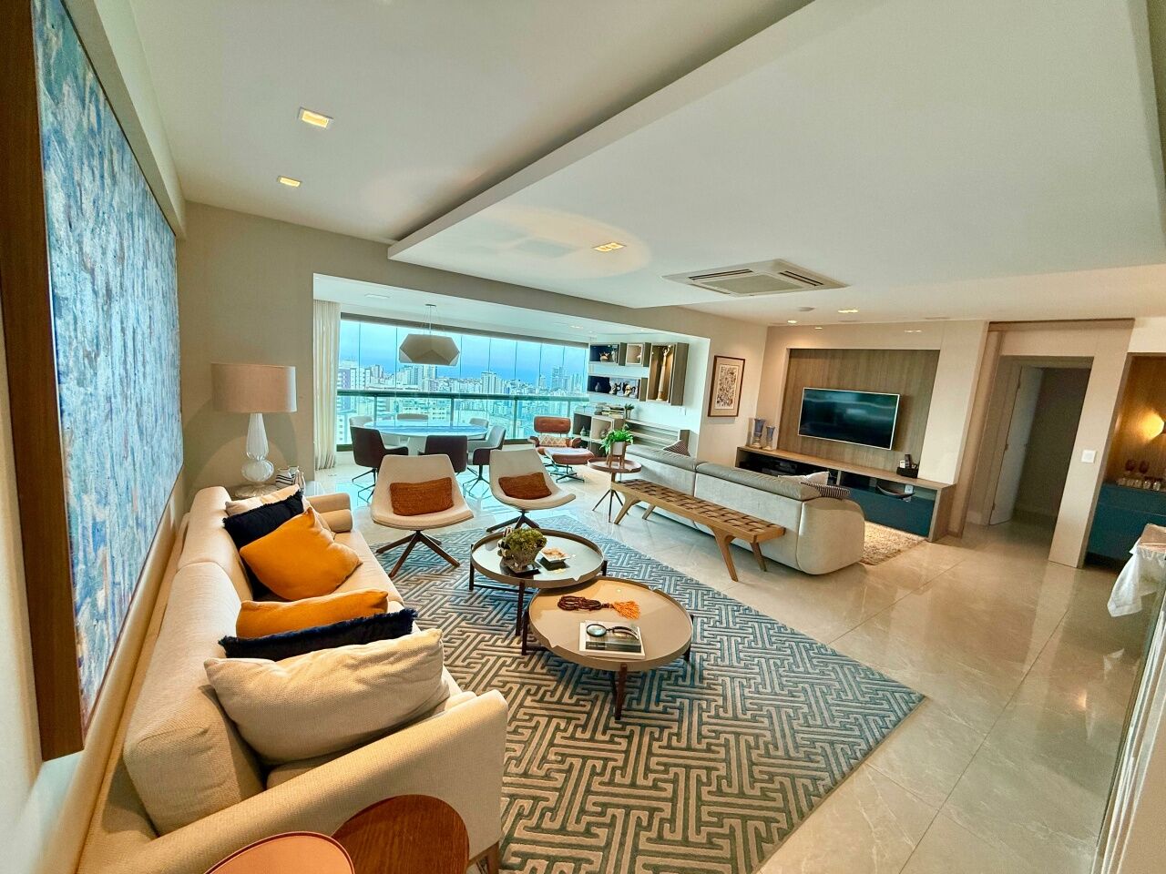 Excelente apartamento, porteira fechada, nascente, fino acabamento, de 162m², com 3 quartos, 3 suítes, piso em porcelanato, home office, varanda goumet incoporada com fechamento em reiki, sala de jantar, sala de estar, lavabo, armários planejados em todos os cômodos, projeto de iluminação, rebaixamento em gesso, cozinha espaçosa, área de serviço, vista mar, andar alto, e três vagas de garagem.