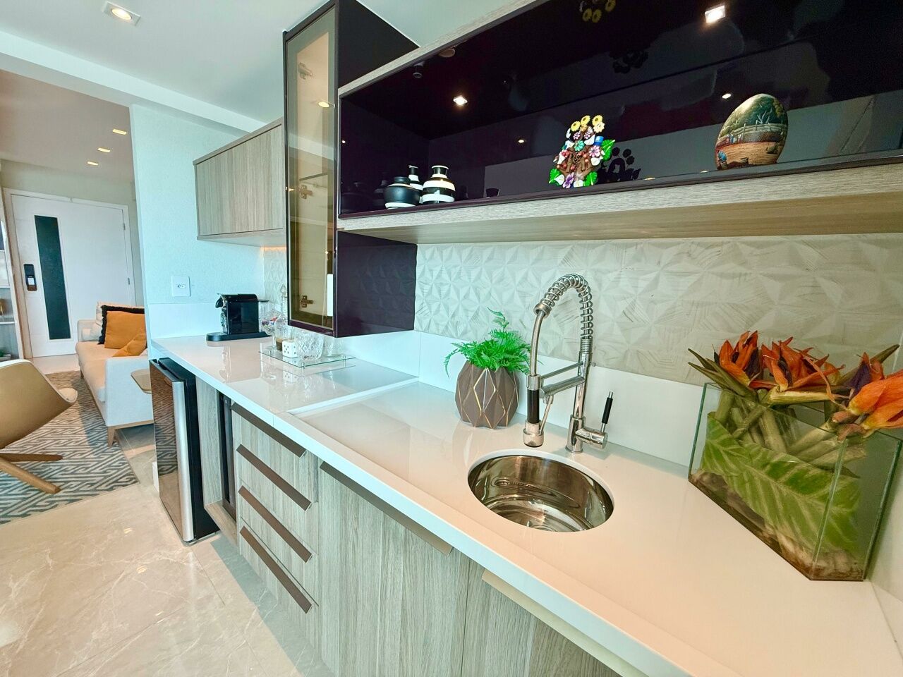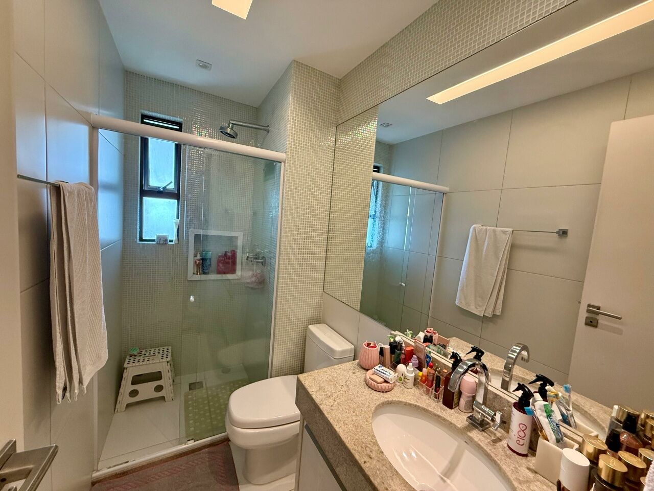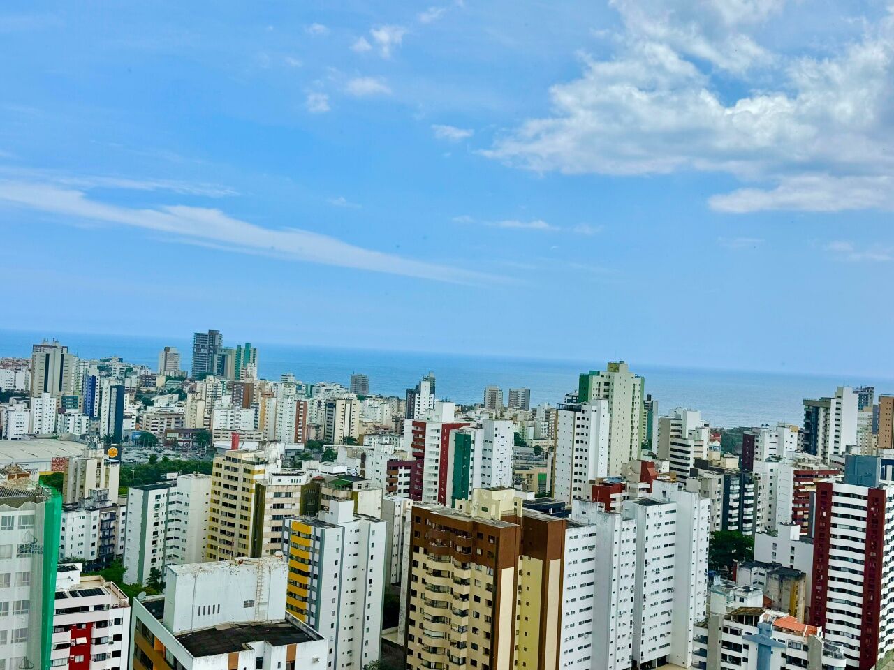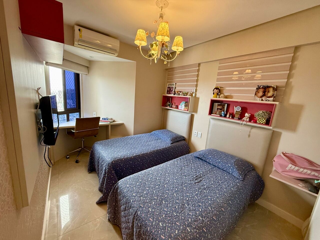 Excelente apartamento, porteira fechada, nascente, fino acabamento, de 162m², com 3 quartos, 3 suítes, piso em porcelanato, home office, varanda goumet incoporada com fechamento em reiki, sala de jantar, sala de estar, lavabo, armários planejados em todos os cômodos, projeto de iluminação, rebaixamento em gesso, cozinha espaçosa, área de serviço, vista mar, andar alto, e três vagas de garagem.
