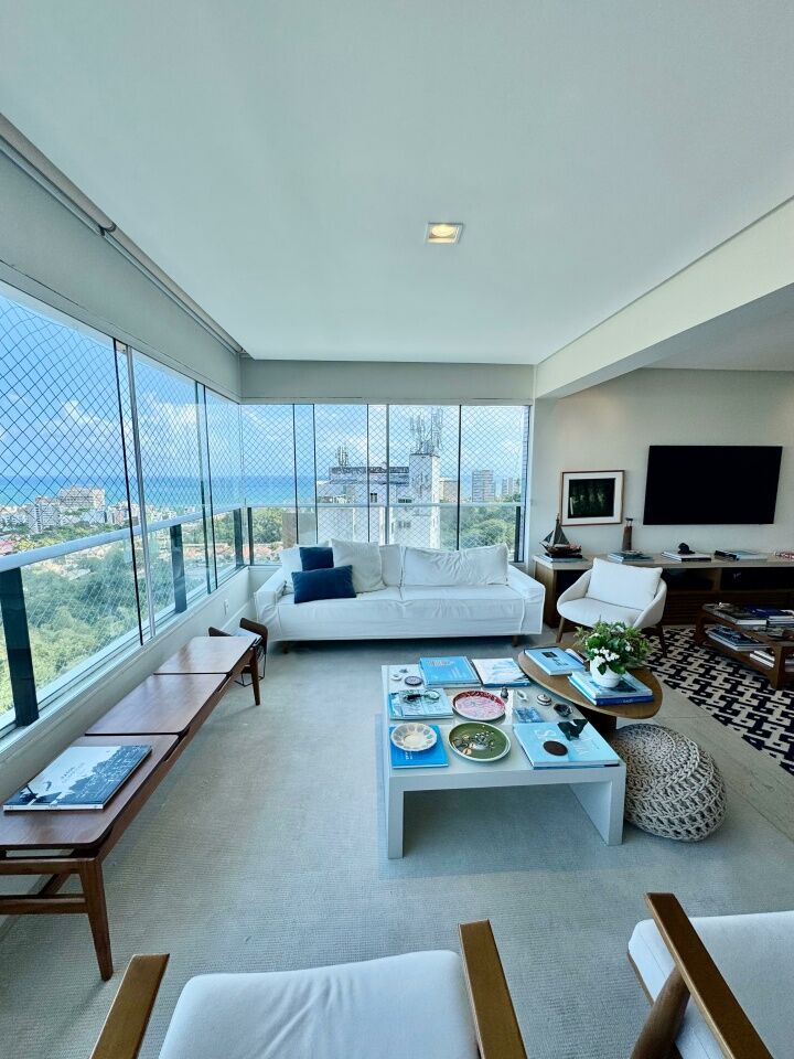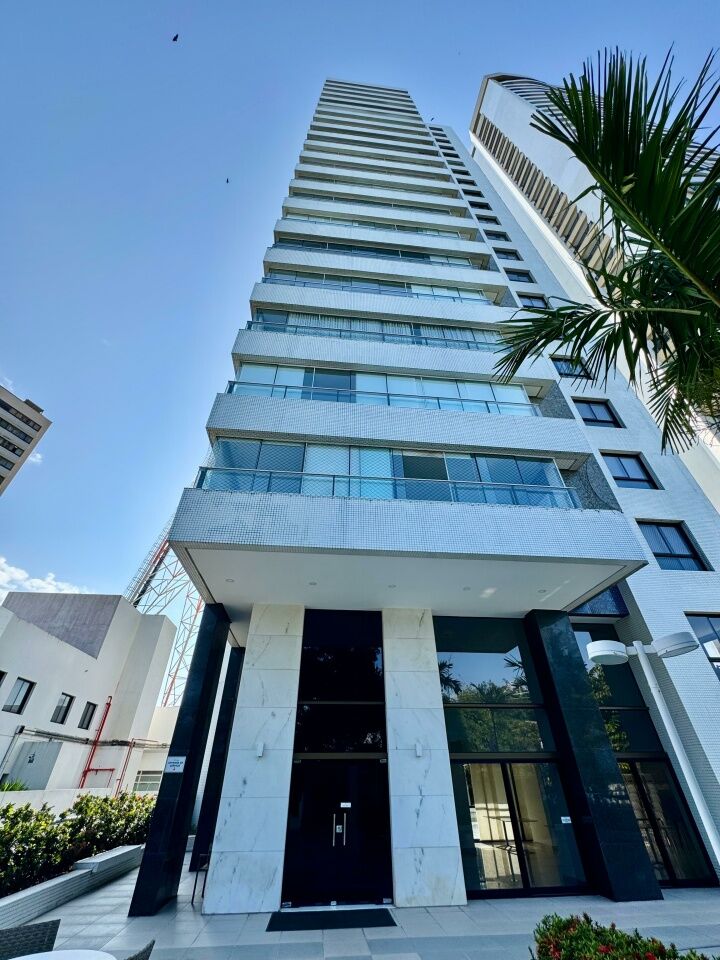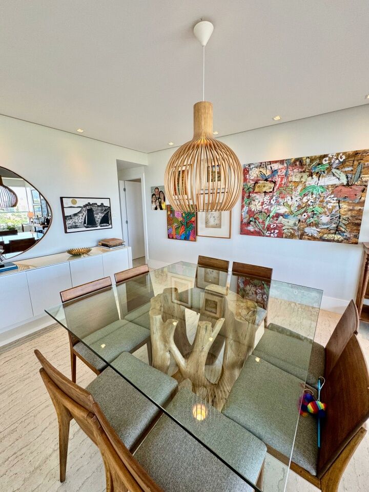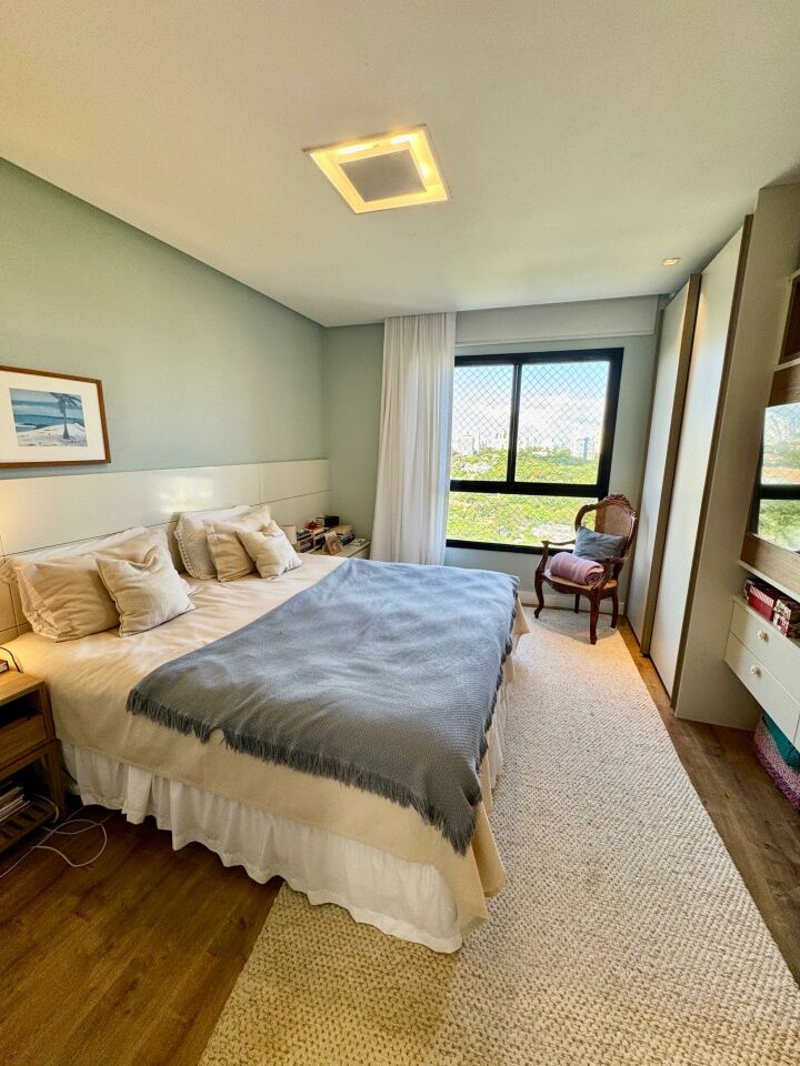 Excelente apartamento, nascente, fino acabamento, de 183m², com 3 quartos, 3 suítes, closet, piso em porcelanato, varanda integrada com fechamento em reiki, living amplo, projeto de iluminação, teto rebaixado, lavabo, sala de estar, sala de jantar, armários planejados kitchens em todos os cômodos, ar condicionado, rouaria, cozinha espaçosa, dependencia completa, andar alto, vista mar, ventilação cruzada, depósito, ponto de carga pra carro elétrico e três vagas de garagem soltas.