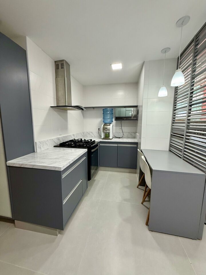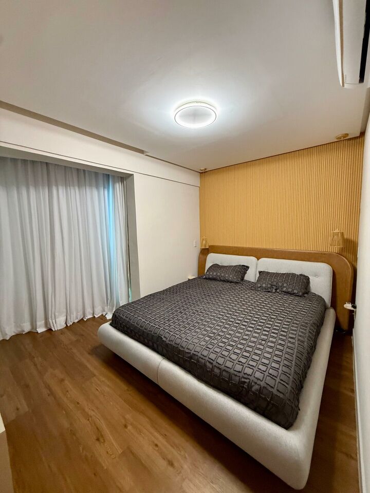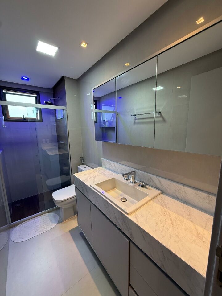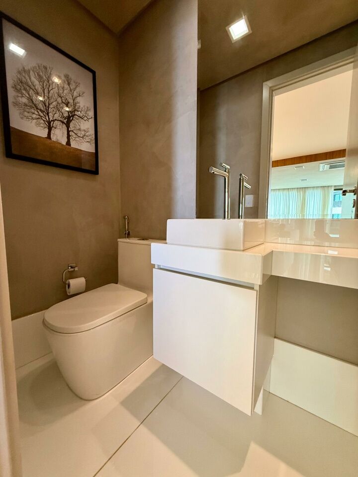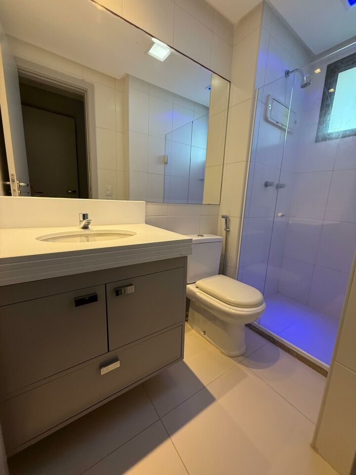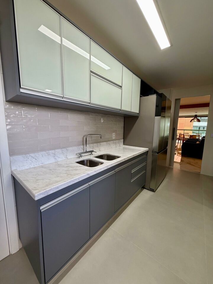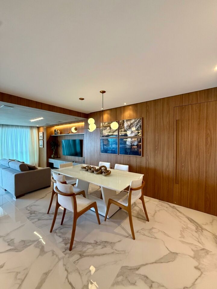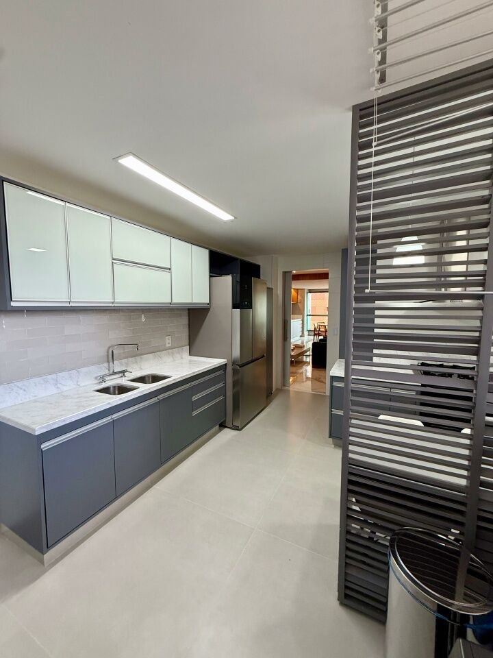 Excelente apartamento, porteira fechada, nascente, andar alto, fino acabamento, de 152m², com 3 quartos, 3 suítes, piso frio, home office, varanda incorporada com fechamento em reiki, projeto de iluminação com teto rebaixado em gesso, sala de jantar, sala de estar, living amplo, lavabo, armários planejados em todos os cômodos, ar condicionado, cozinha espaçosa, área de serviço com banheiro, gás encanado e três vagas de garagem, sendo duas soltas.