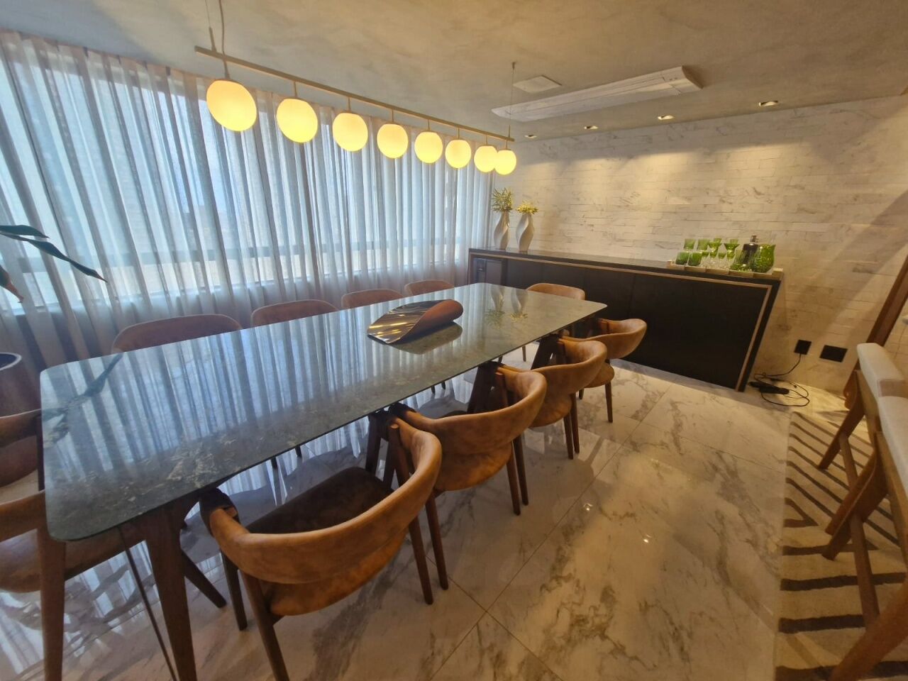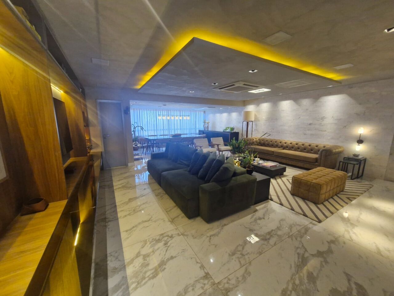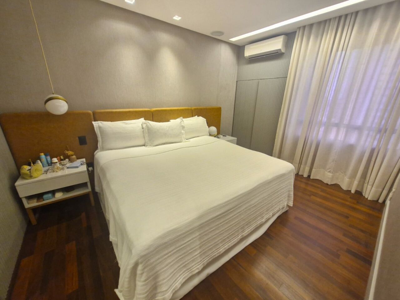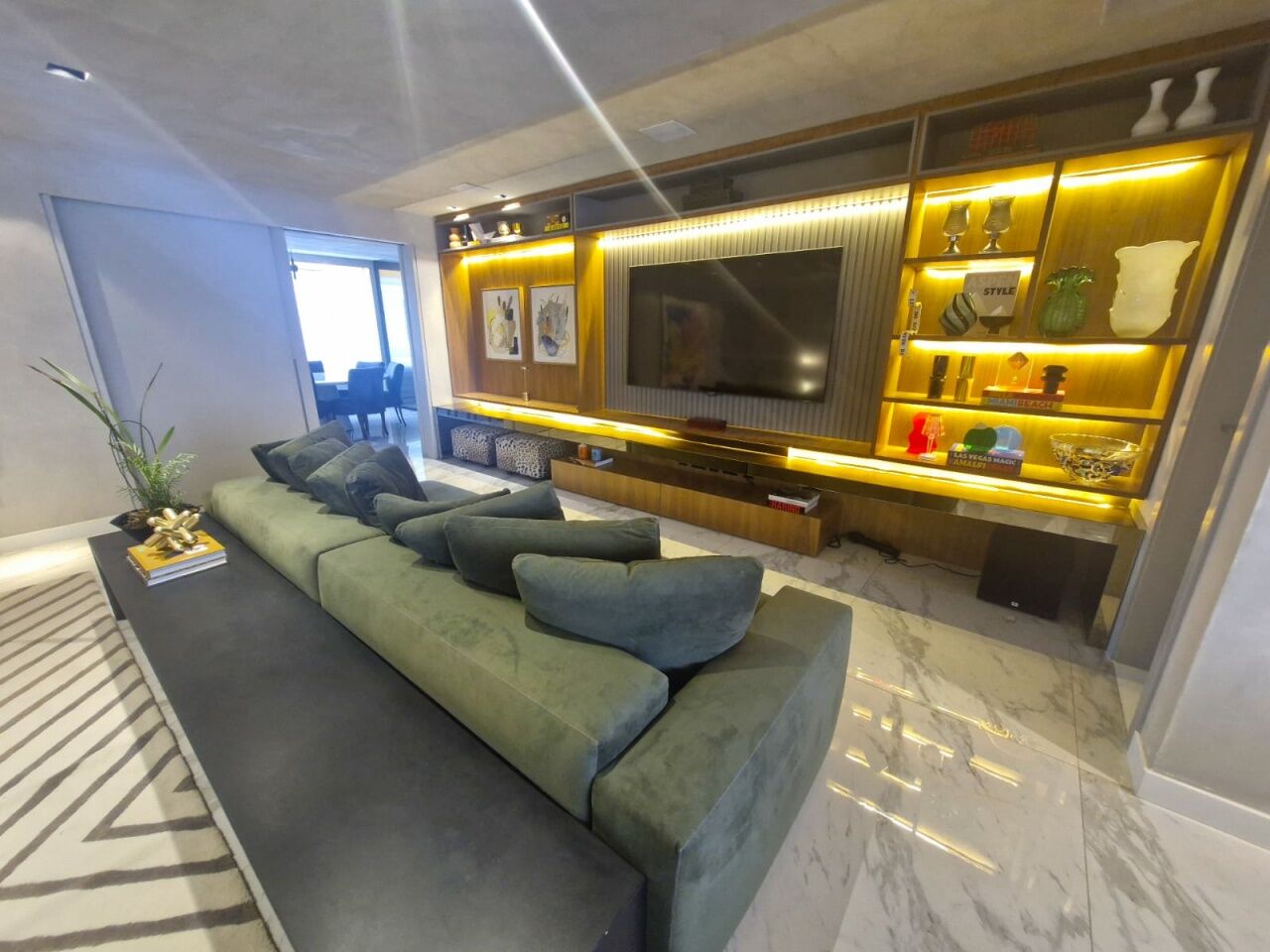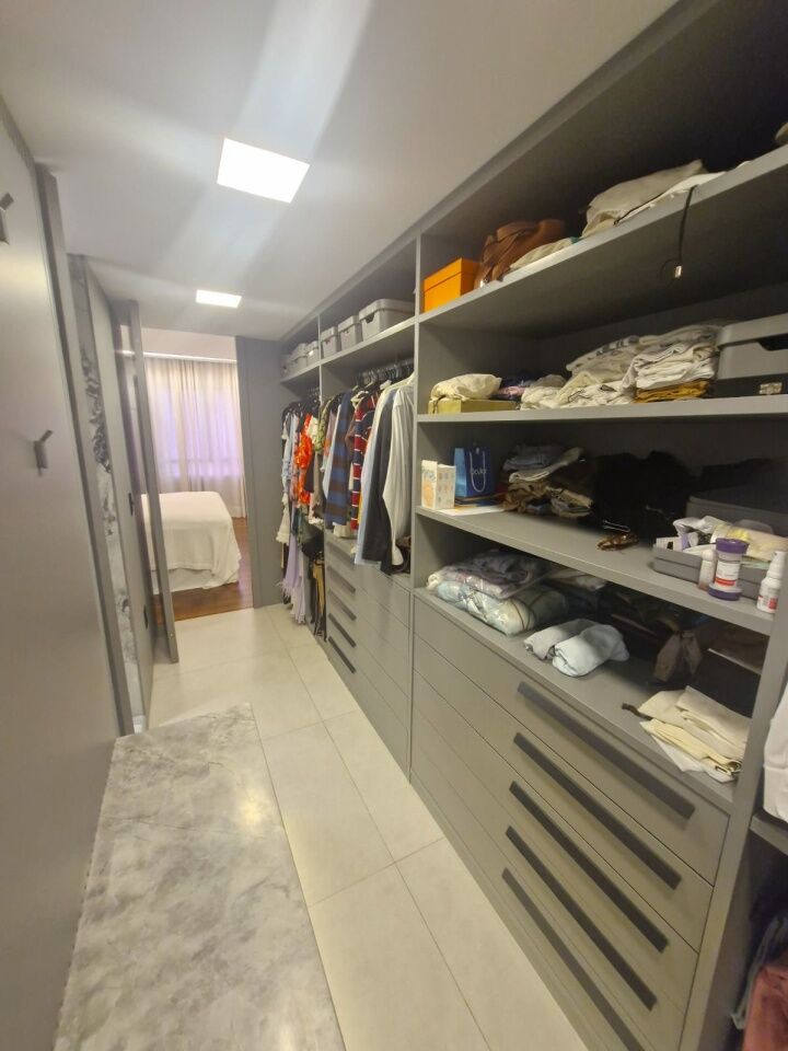 Excelente apartamento, porteira fechada, finamente decorado, de 200m², com 3 quartos, 3 suítes, piso frio, gabinete, closet, adega varanda com reiki, dining room, living room, lavabo, armários planejados em todos os cômodos, ambientes climatizados, cozinha na varanda, móveis e decoração definidos por designers, projeto de iluminação com teto rebaixado, depedência completa, e quatro vagas de garagem.