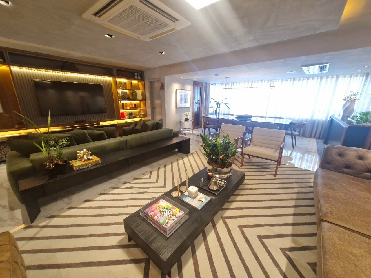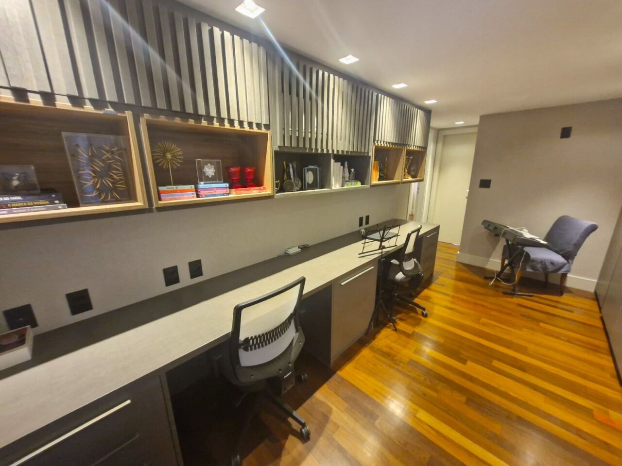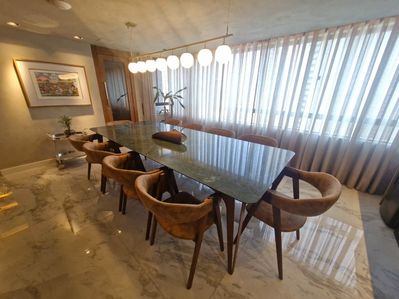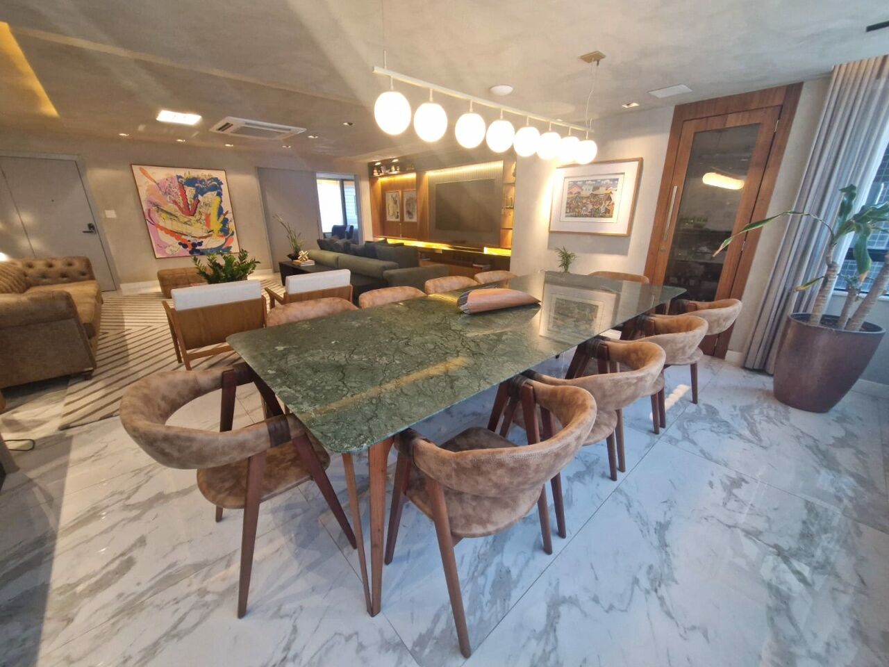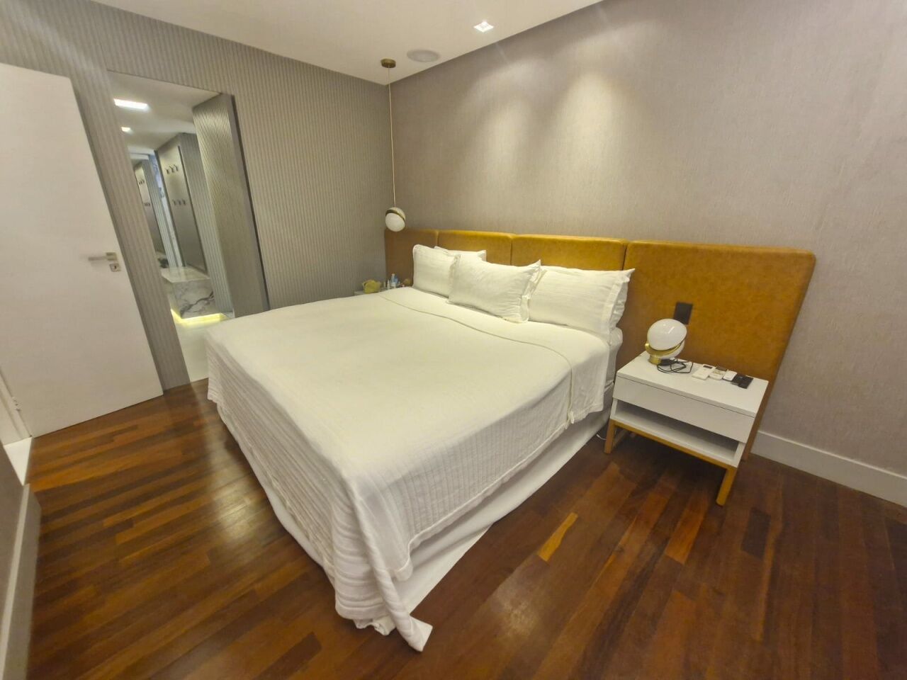 Excelente apartamento, porteira fechada, finamente decorado, de 200m², com 3 quartos, 3 suítes, piso frio, gabinete, closet, adega varanda com reiki, dining room, living room, lavabo, armários planejados em todos os cômodos, ambientes climatizados, cozinha na varanda, móveis e decoração definidos por designers, projeto de iluminação com teto rebaixado, depedência completa, e quatro vagas de garagem.
