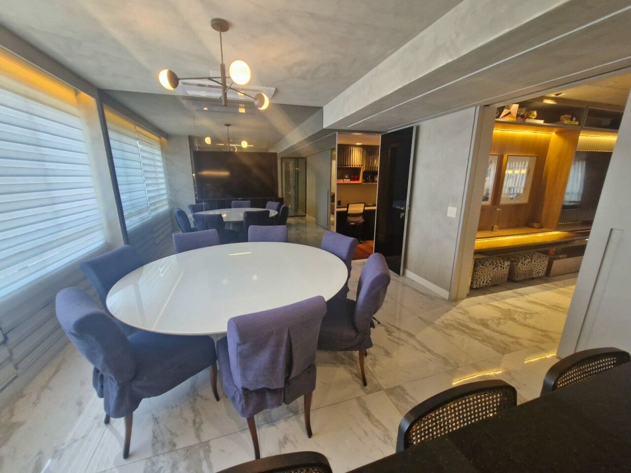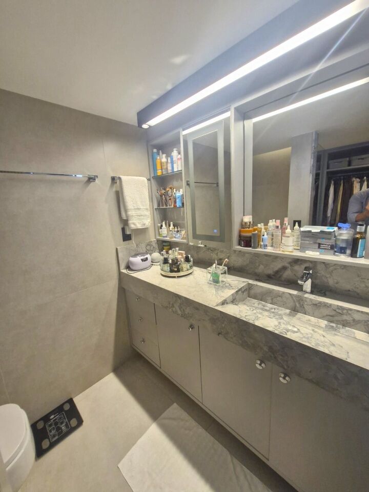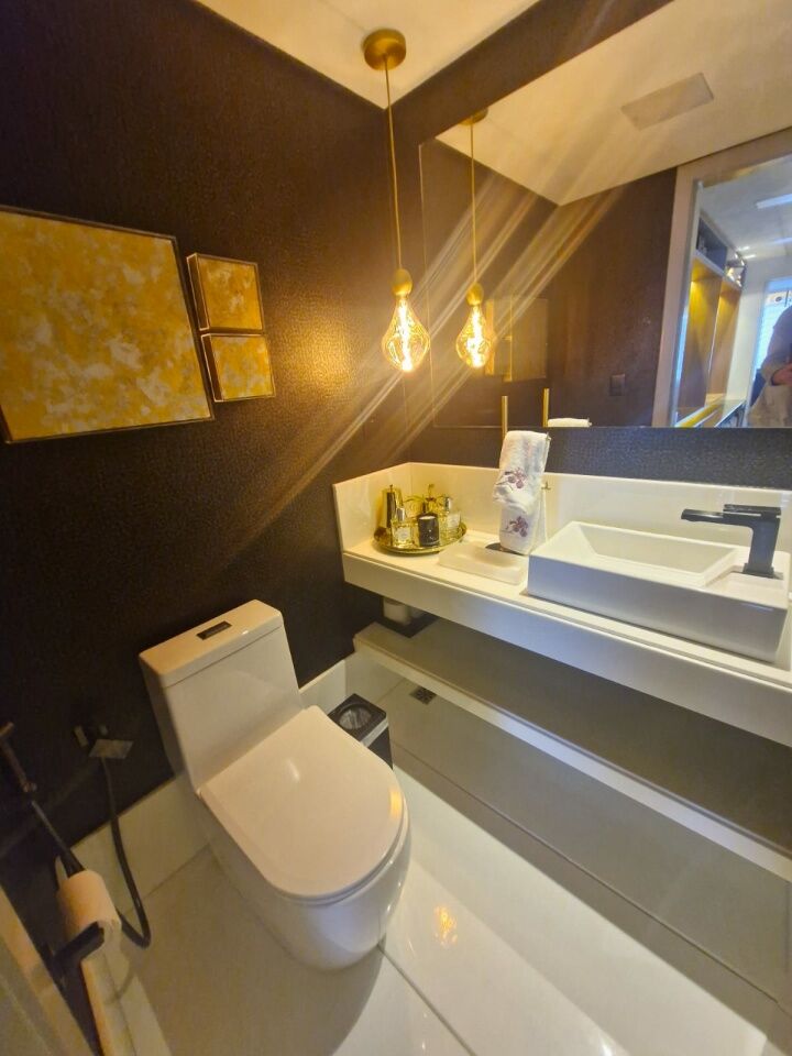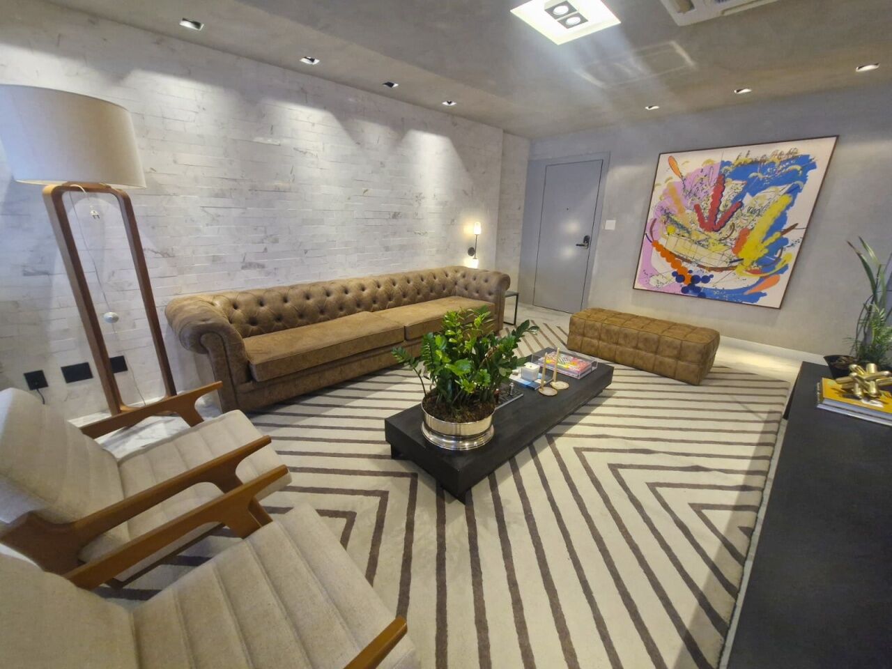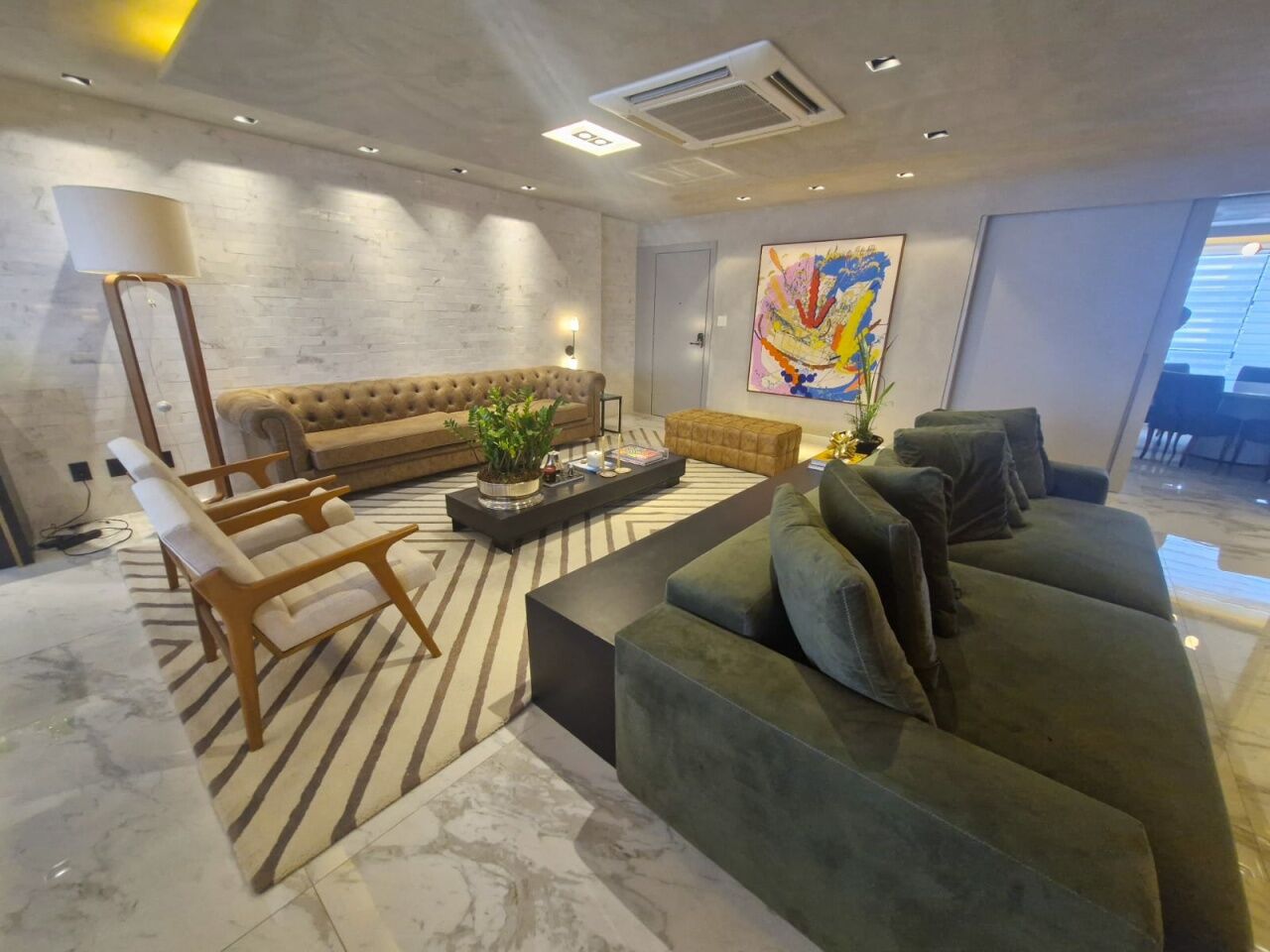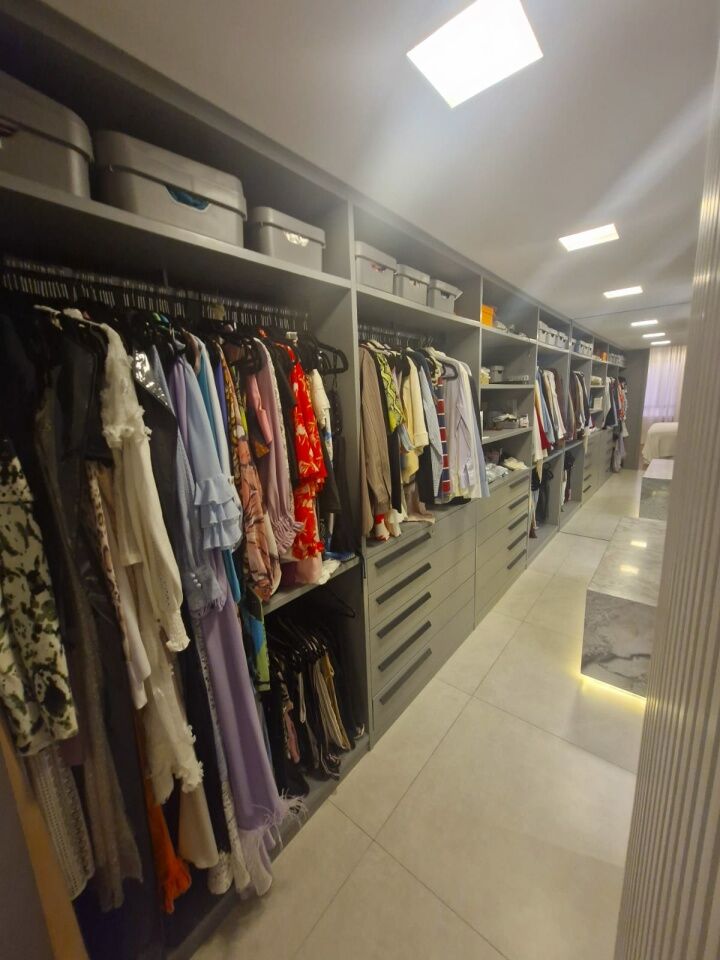 Excelente apartamento, porteira fechada, finamente decorado, de 200m², com 3 quartos, 3 suítes, piso frio, gabinete, closet, adega varanda com reiki, dining room, living room, lavabo, armários planejados em todos os cômodos, ambientes climatizados, cozinha na varanda, móveis e decoração definidos por designers, projeto de iluminação com teto rebaixado, depedência completa, e quatro vagas de garagem.