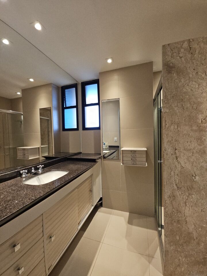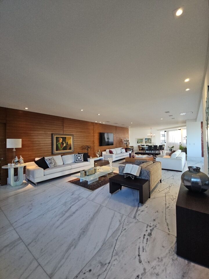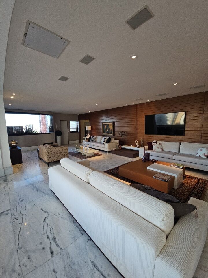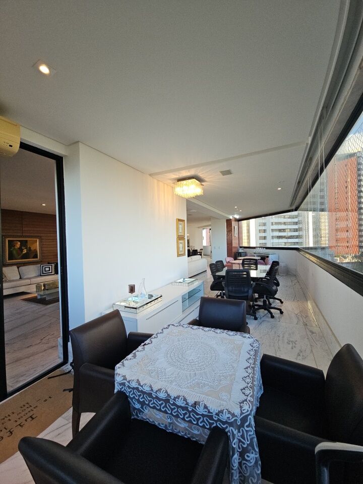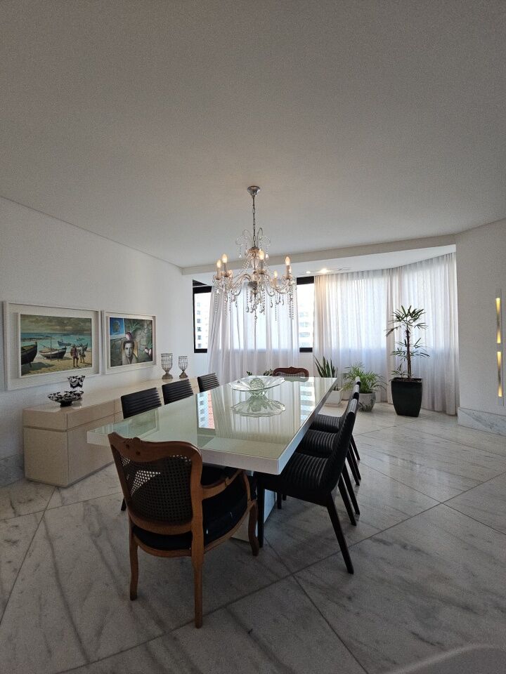Excelente apartamento, nascente, fino acabamento, de 330m², com 4 quartos, 3 suítes, piso em mármore branco, home office, home theater, closet, varanda incorporada com fechamento em reiki, living amplo, lavabo, armários planejados em todos os cômodos, ambientes climatizados, cozinha espaçosa, projeto de iluminiação com teto rebaixado, depedência completa, andar intermediário, ventilação natural, e quatro vagas de garagem cobertas e soltas.