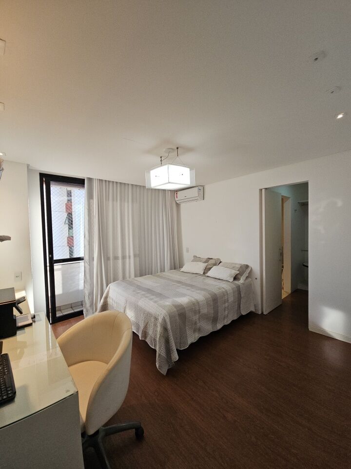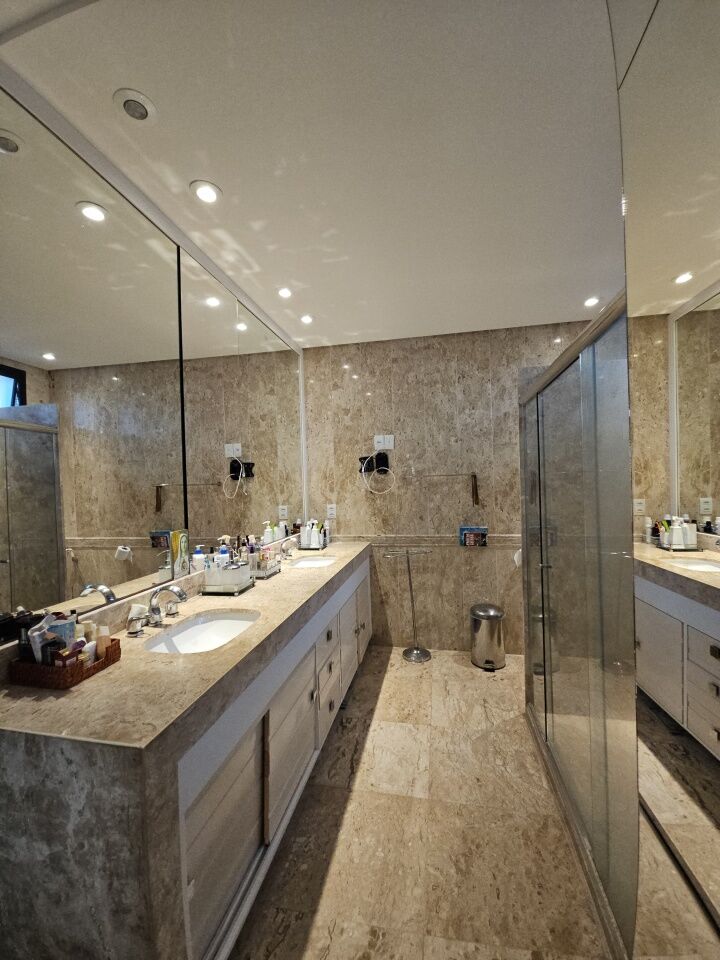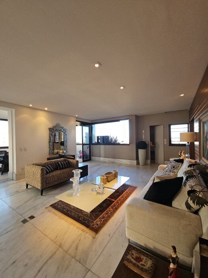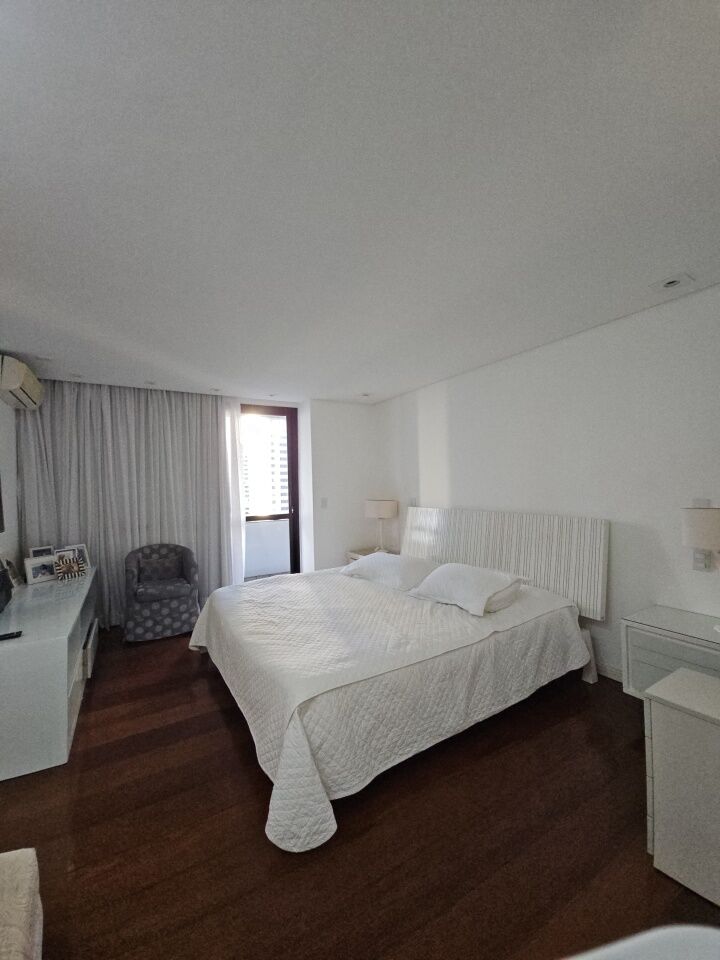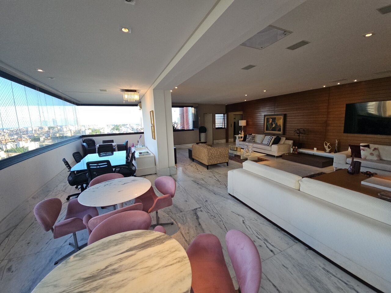 Excelente apartamento, nascente, fino acabamento, de 330m², com 4 quartos, 3 suítes, piso em mármore branco, home office, home theater, closet, varanda incorporada com fechamento em reiki, living amplo, lavabo, armários planejados em todos os cômodos, ambientes climatizados, cozinha espaçosa, projeto de iluminiação com teto rebaixado, depedência completa, andar intermediário, ventilação natural, e quatro vagas de garagem cobertas e soltas.