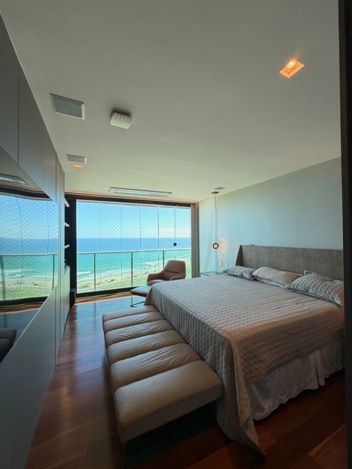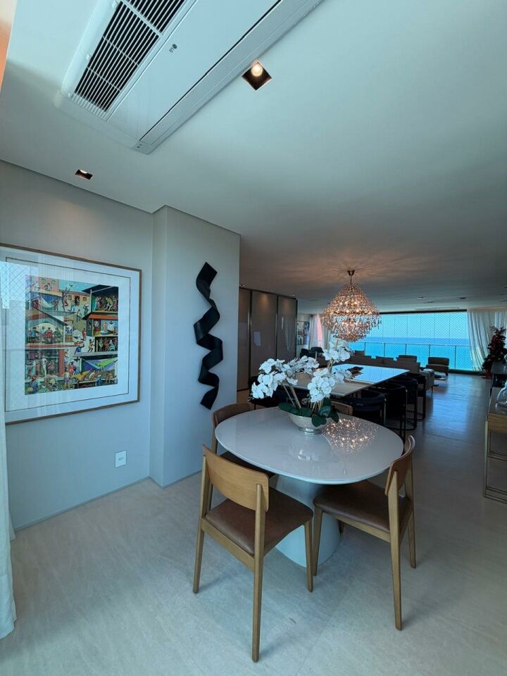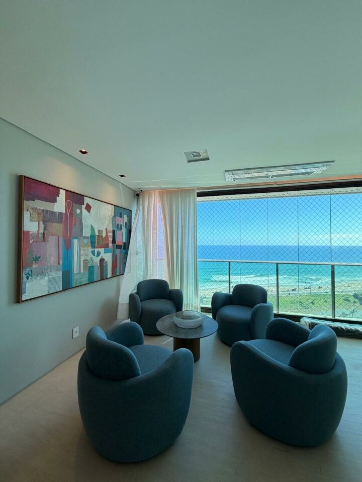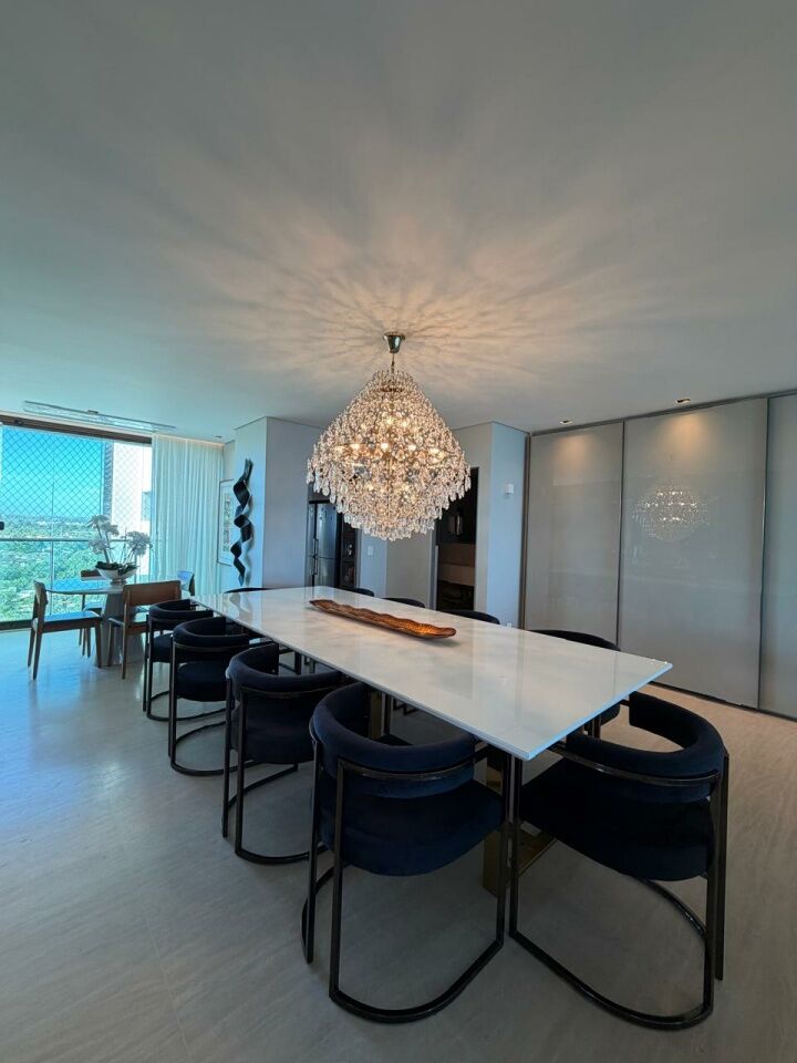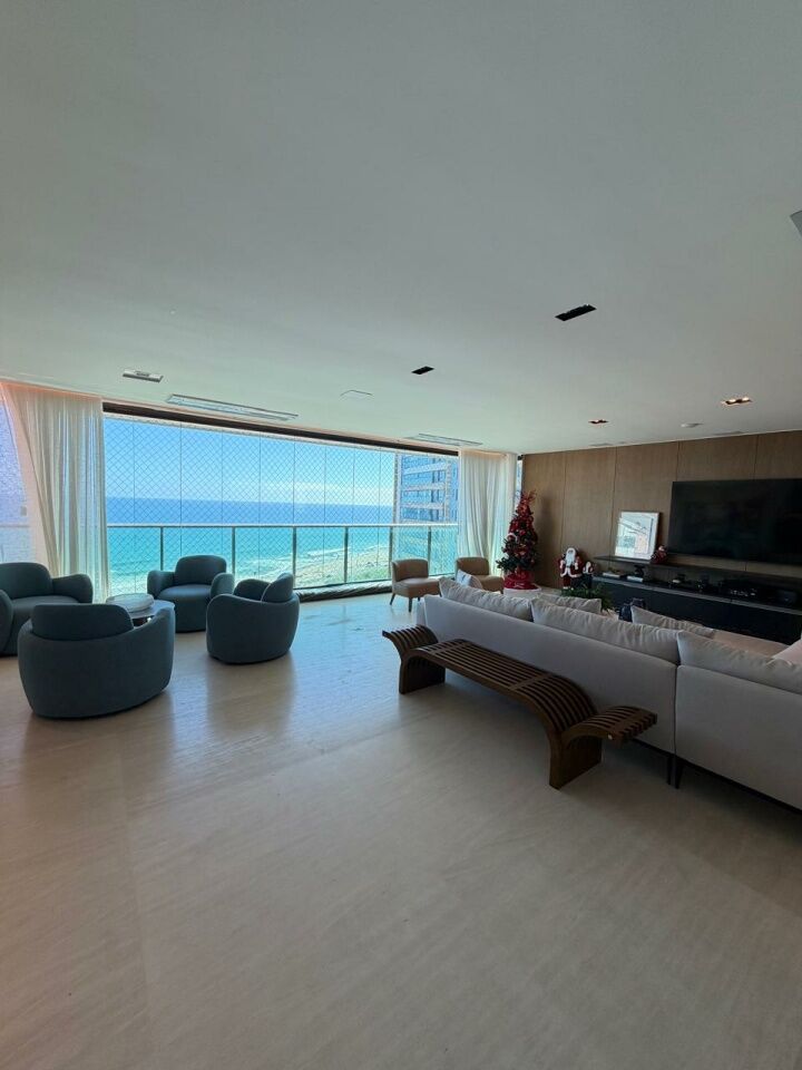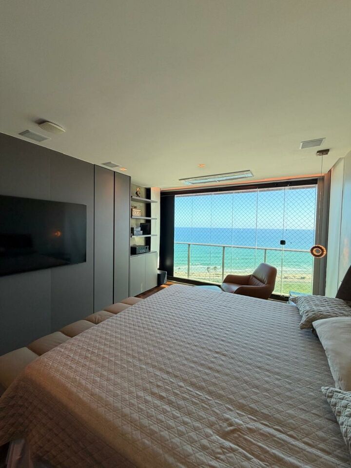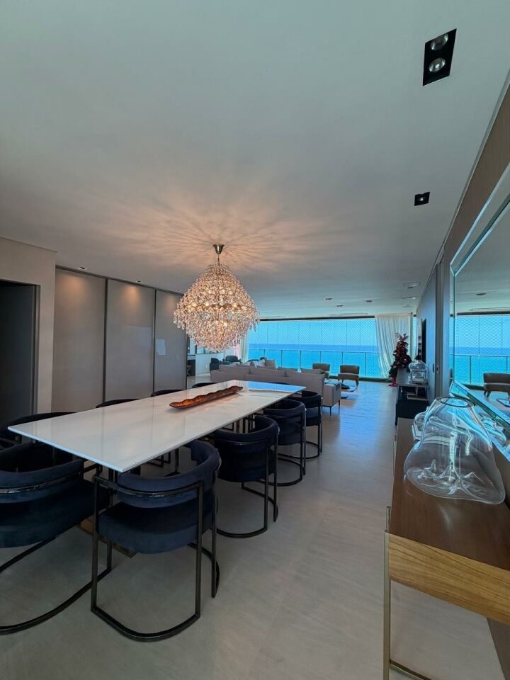 Excelente apartamento, nascente, mobiliado, finamente decorado, de 235m², com 4 quartos, revertidos pra 3 suítes, closet, hidromassagem, piso frio, home office, varanda gourmet incorporada com fechamento em reiki, dining room, living room, lavabo, armários planejados em todos os cômodos, ambientes climatizados, cozinha espaçosa com coifa, móveis e decoração escolhidos por designers renomados, dependência completa, quatro vagas, depósito e vista mar.