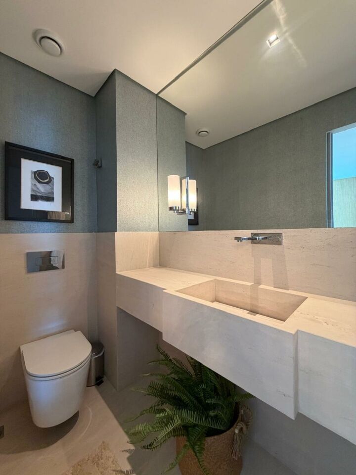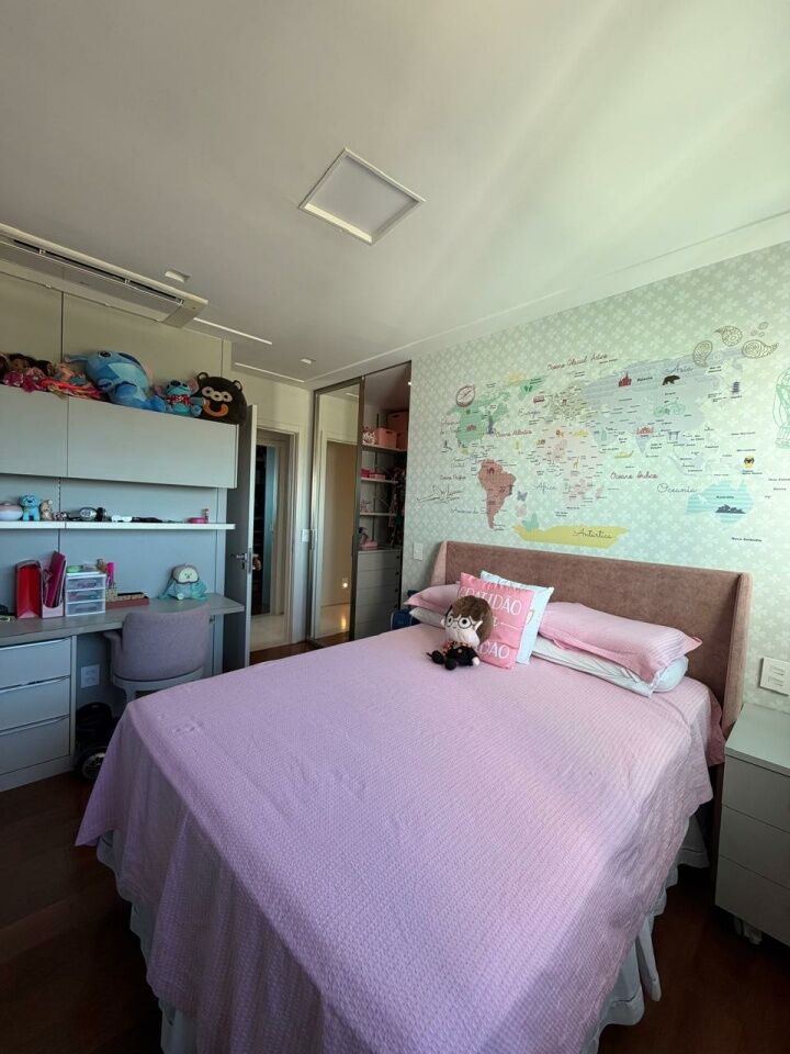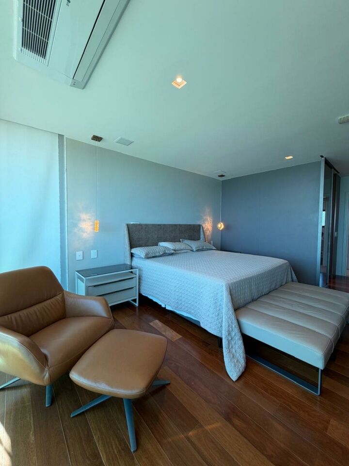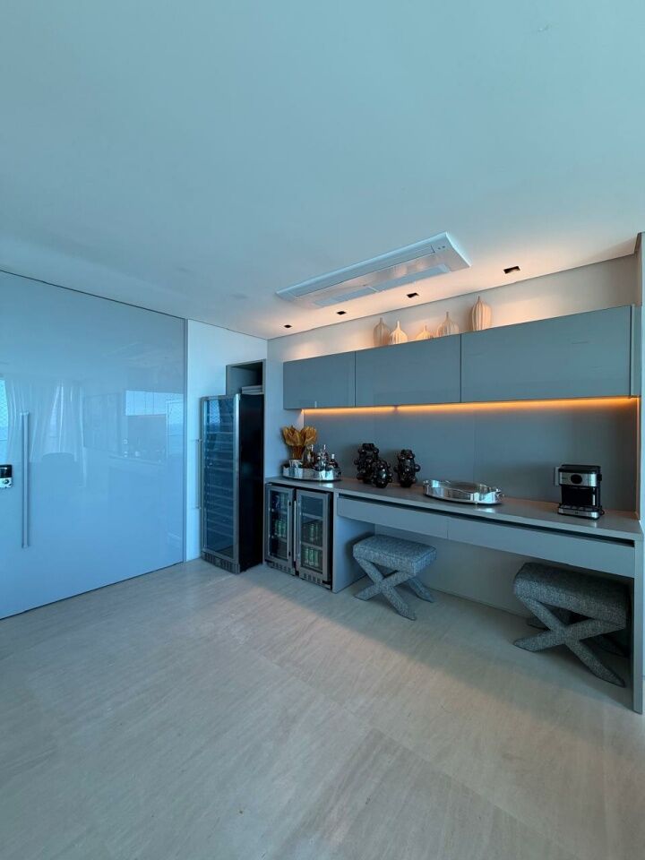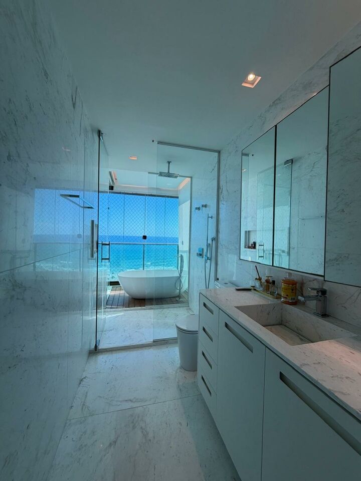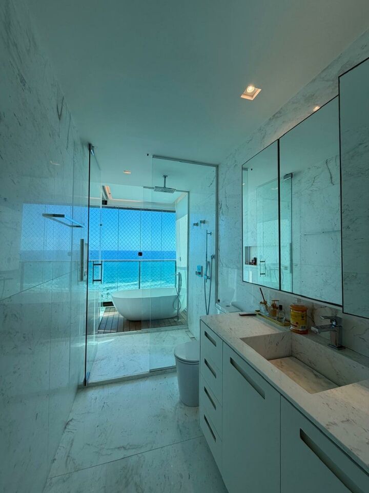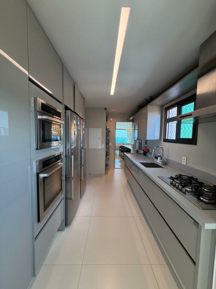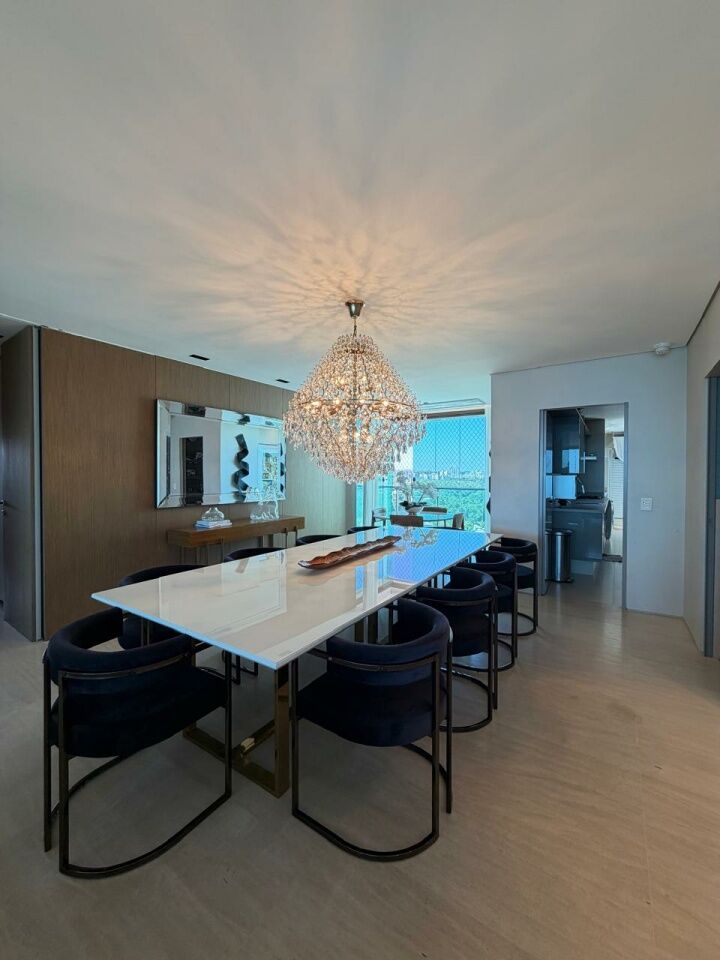 Excelente apartamento, nascente, mobiliado, finamente decorado, de 235m², com 4 quartos, revertidos pra 3 suítes, closet, hidromassagem, piso frio, home office, varanda gourmet incorporada com fechamento em reiki, dining room, living room, lavabo, armários planejados em todos os cômodos, ambientes climatizados, cozinha espaçosa com coifa, móveis e decoração escolhidos por designers renomados, dependência completa, quatro vagas, depósito e vista mar.