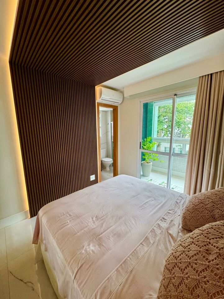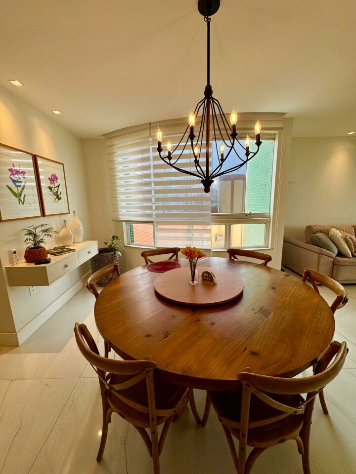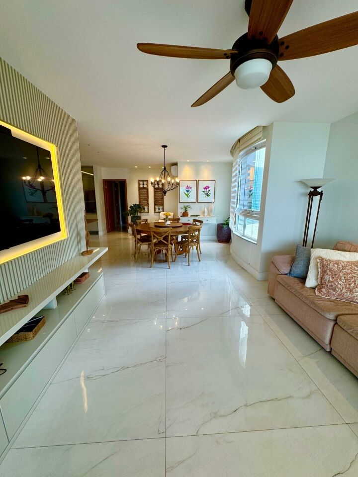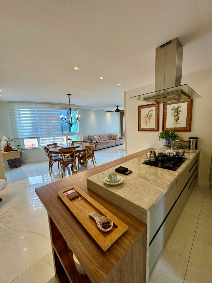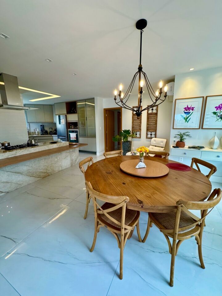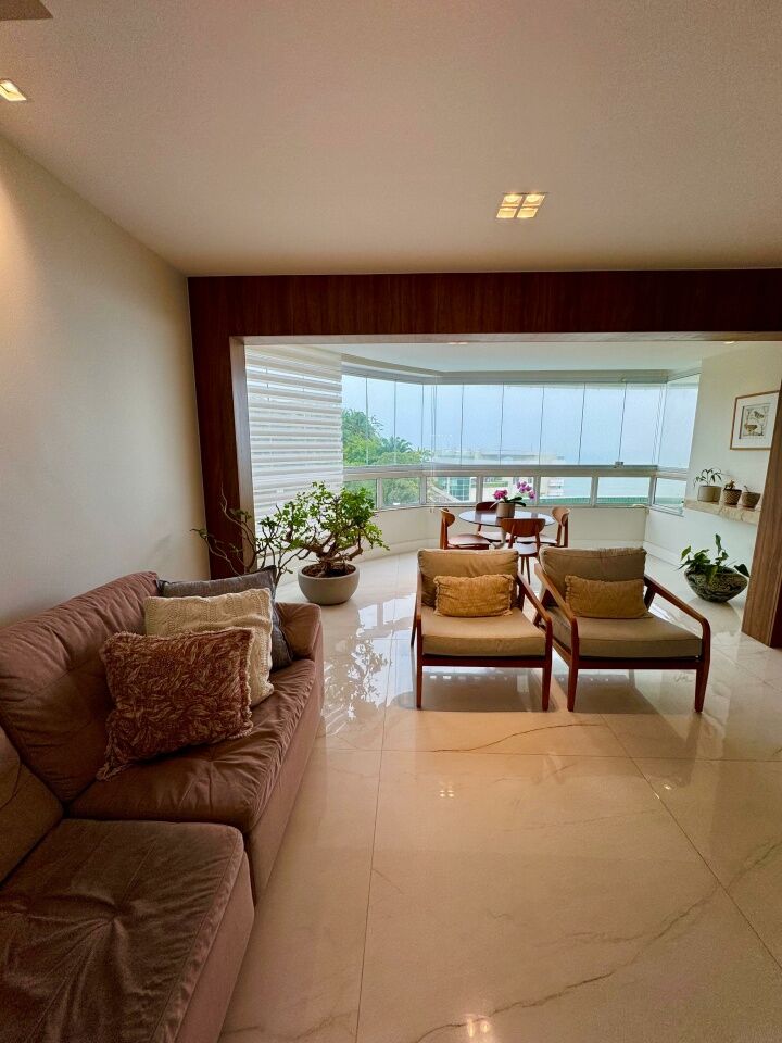 Excelente apartamento, nascente, finamente decorado, de 185m², com 4 quartos, 4 suítes, closet, piso em porcelanato, gabinete, varanda canadense, incorporada com fechamento em reiki, living amplo, sala de estar, sala de jantar, lavabo, armários planejados Romanzza em todos os cômodos, ambientes climatizados, roupeiro, projeto de iluminação, teto com rebaixamento em gesso, cozinha em ilha com coifa flutuante, dependência completa, andar baixo, vista mar frontal, e três vagas de garagem cobertas, mais depósito.