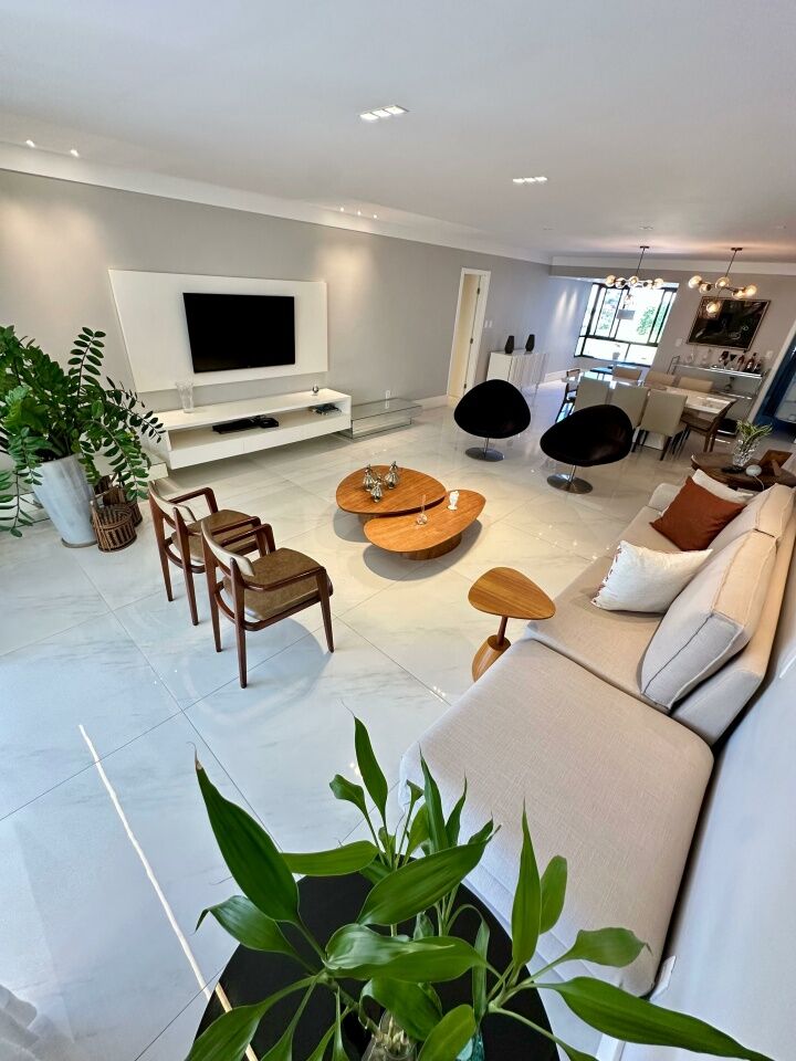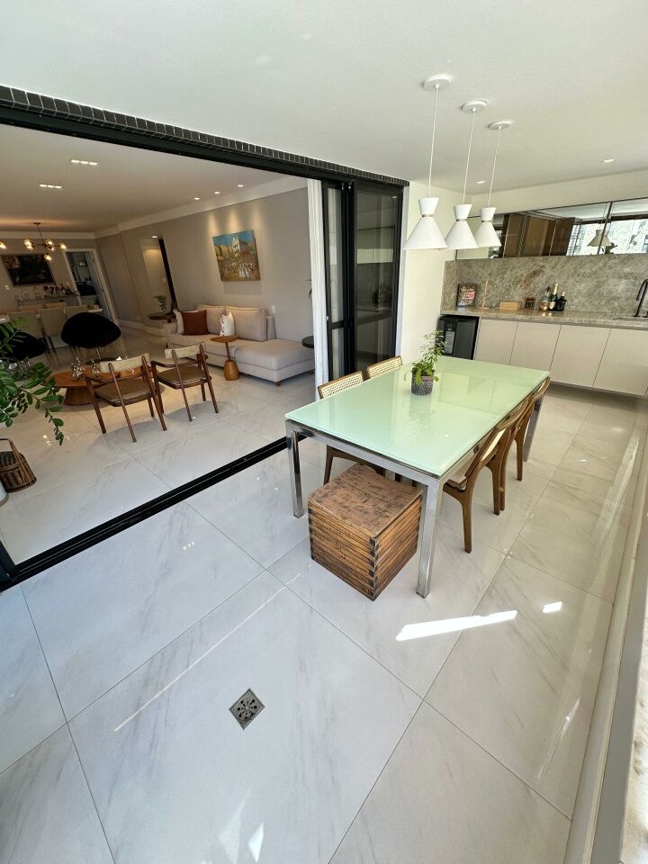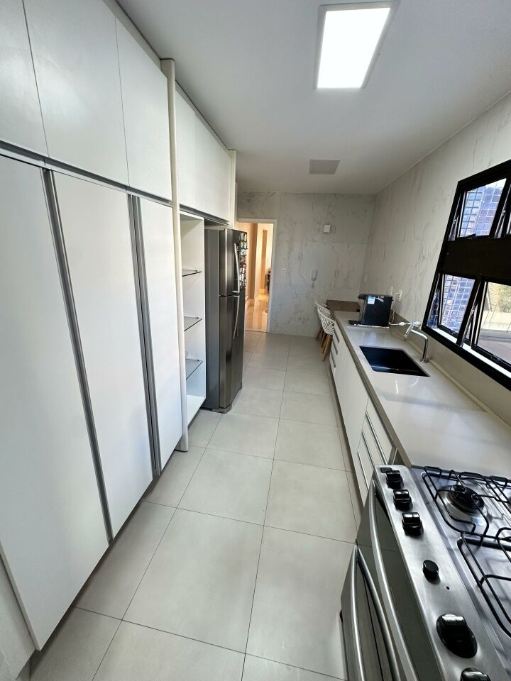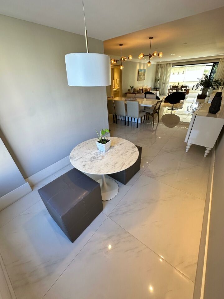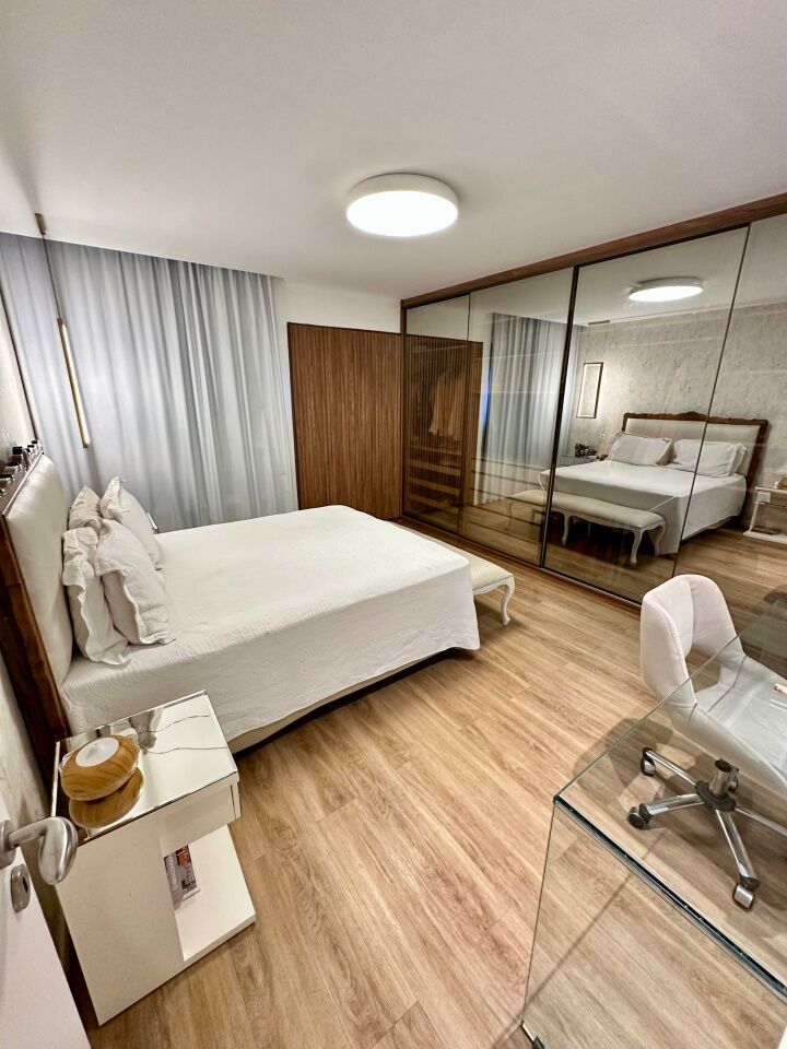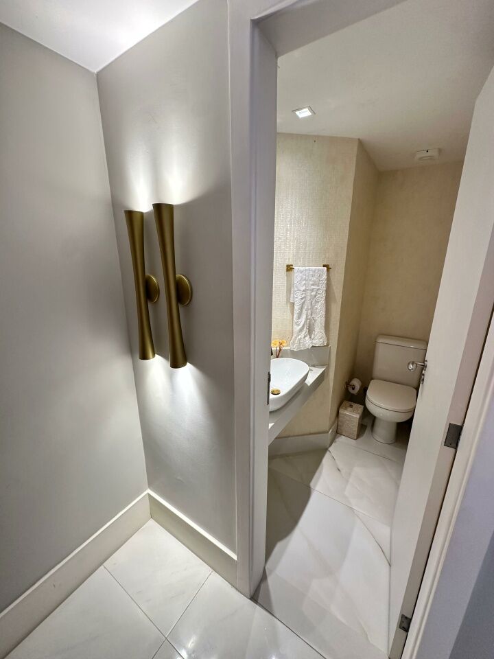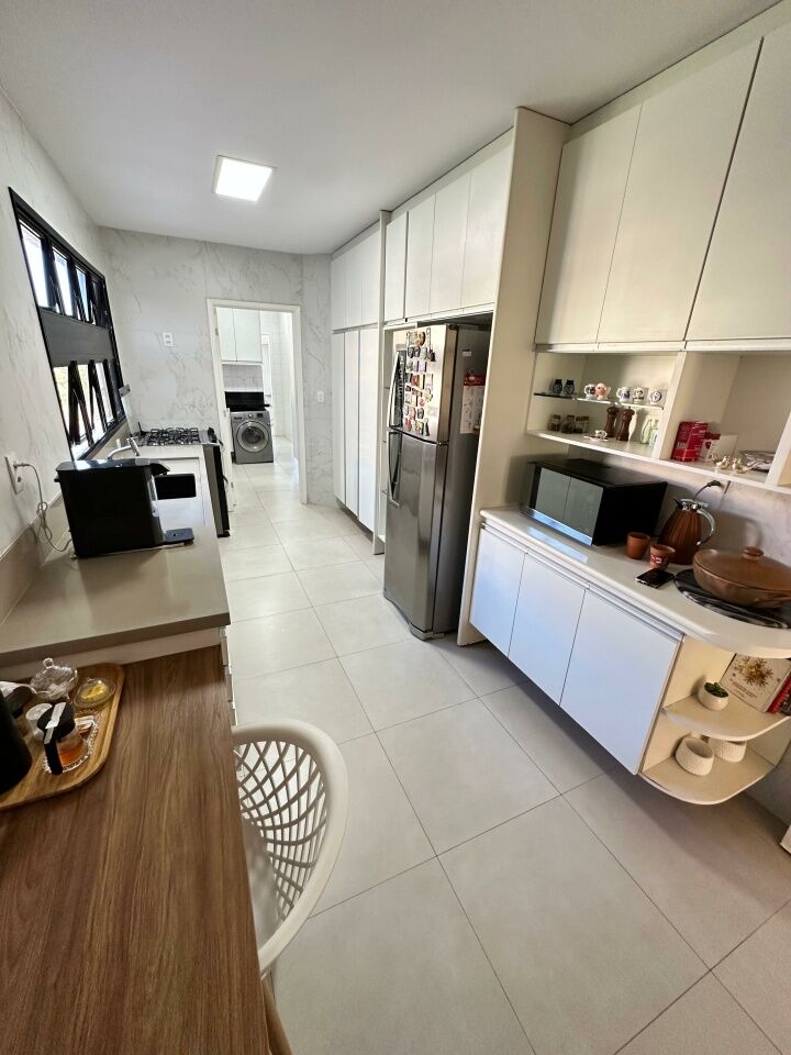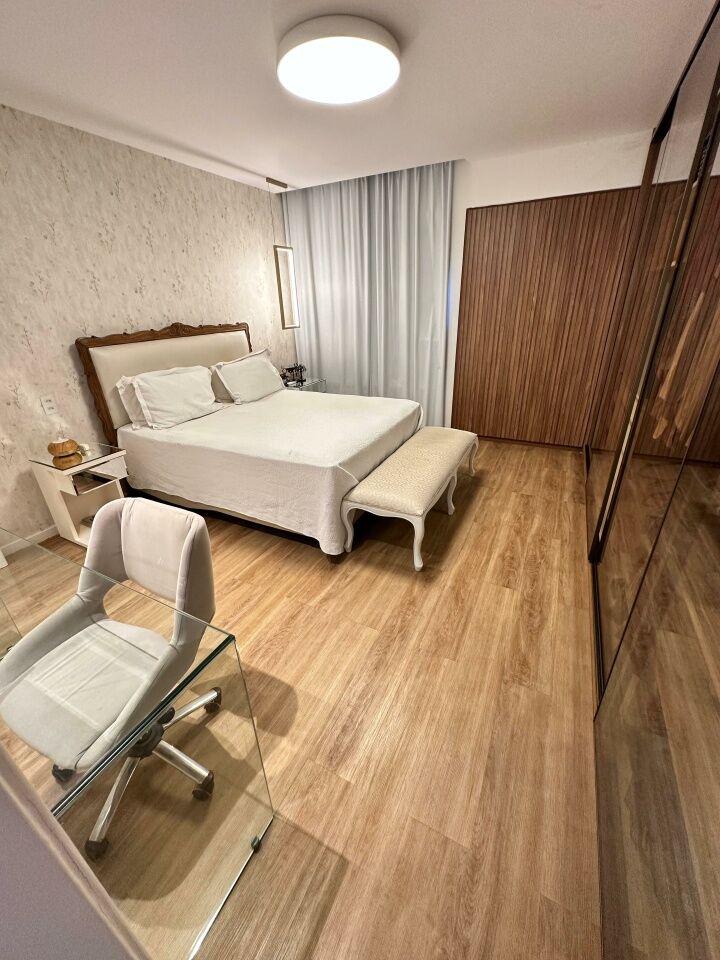 Excelente apartamento, nascente, fino acabamento, de 215m², com 4 quartos, 4 suítes, piso em porcelanato, varanda gourmet com fechamento em reiki, living amplo, sala de estar, sala de jantar, lavabo, teto rebaixado, projeto de iluminação, ambientes climatizados, cozinha integrada à sala, área de serviço com banheiro, andar alto, três vagas de garagem mais depósito.