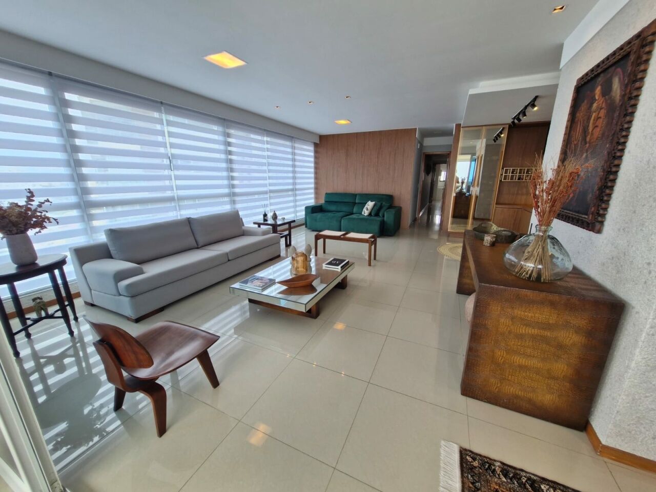 Excelente apartamento, finamente decorada, de 144m², com 3 quartos, 3 suítes, piso frio, home office, varanda gourmet incorporada com fechamento em reiki, sala de jantar, sala de estar, living amplo, lavabo, armários planejados em todos os cômodos, ar condicionado, cozinha espaçosa, área de serviço, dependência completa, andar alto, vista mar, três vagas de garagem.