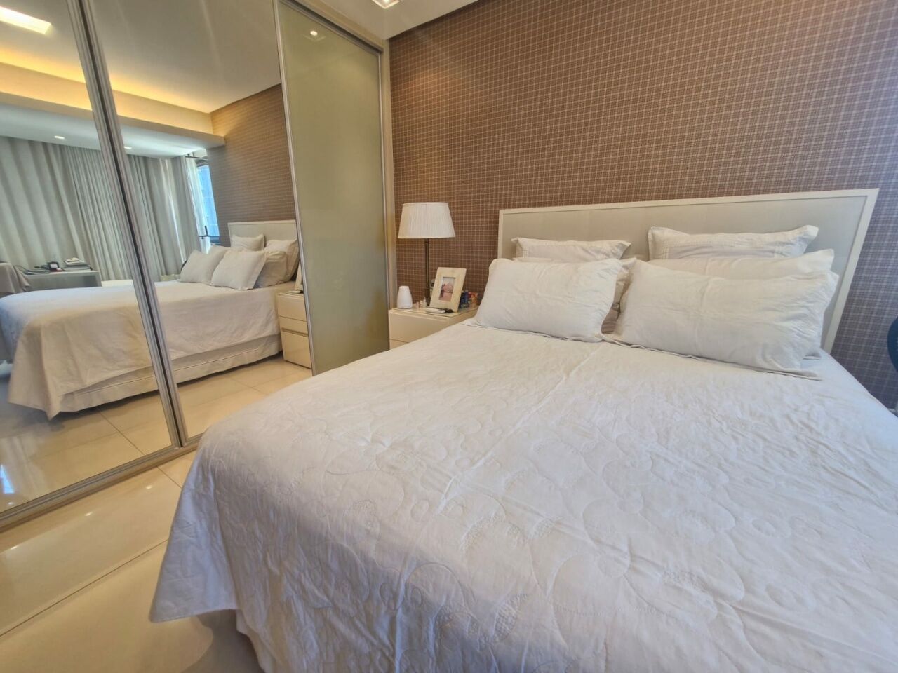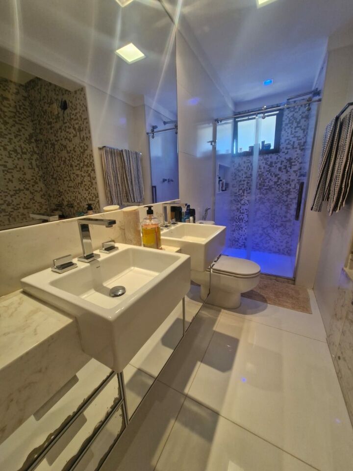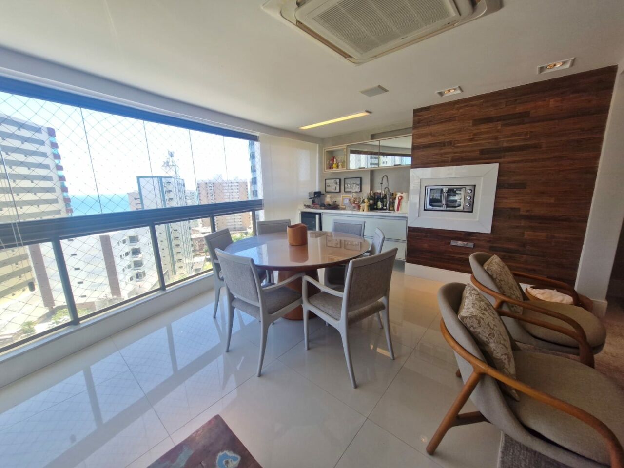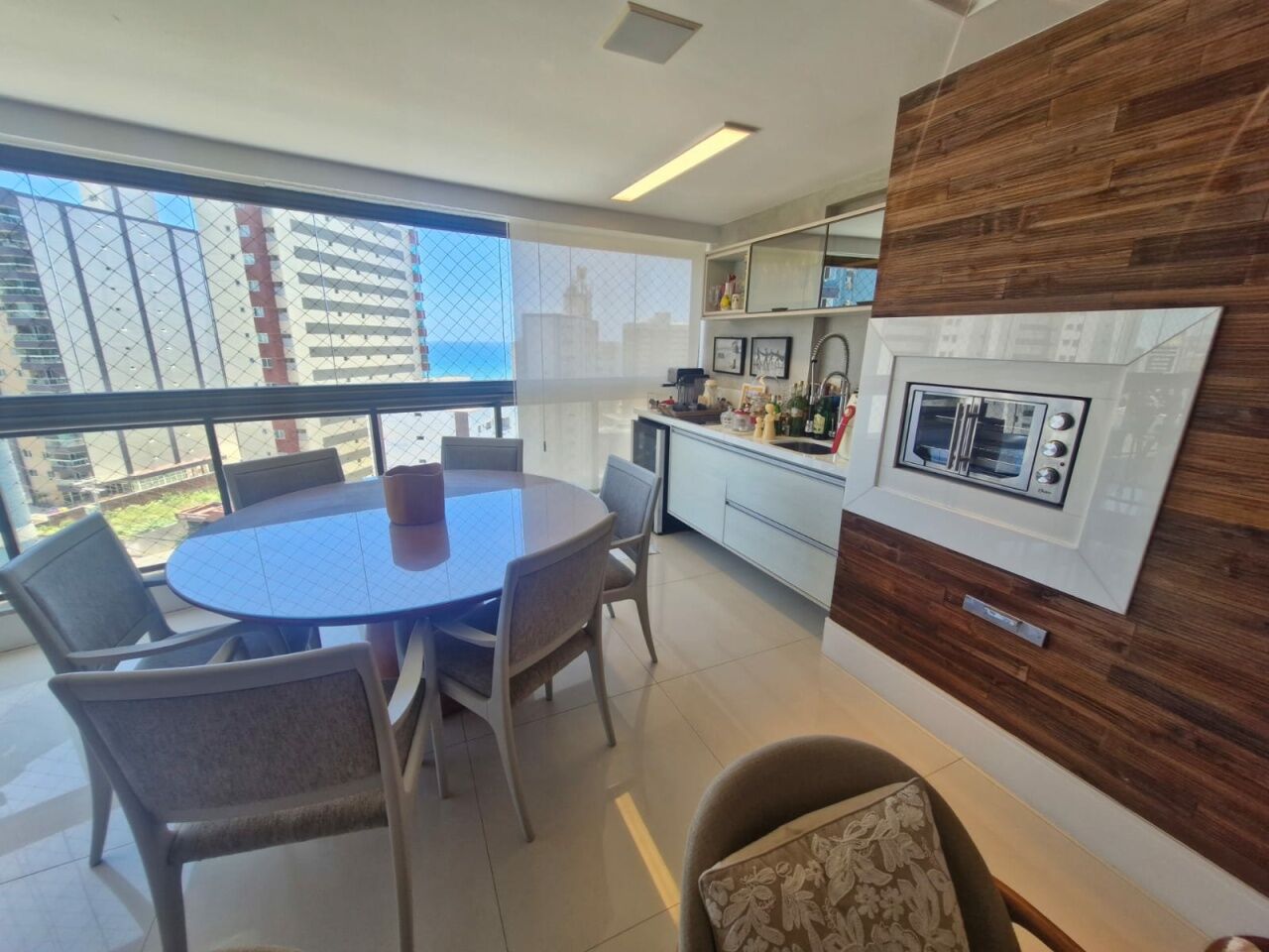 Excelente apartamento, nascente, fino acabamento, de 147m², originalmente com 4 quartos, revertidos pra 3 suítes, piso frio, varanda gourmet integrada com churrsqueira e fechamento em reiki, living amplo, projeto de iluminação, teto rebaixado, lavabo, sala de estar, sala de jantar, armários planejados em todos os cômodos, ar condicionado, cozinha espaçosa, área de serviço, dependencia completa, andar alto, vista mar, e três vagas de garagem.