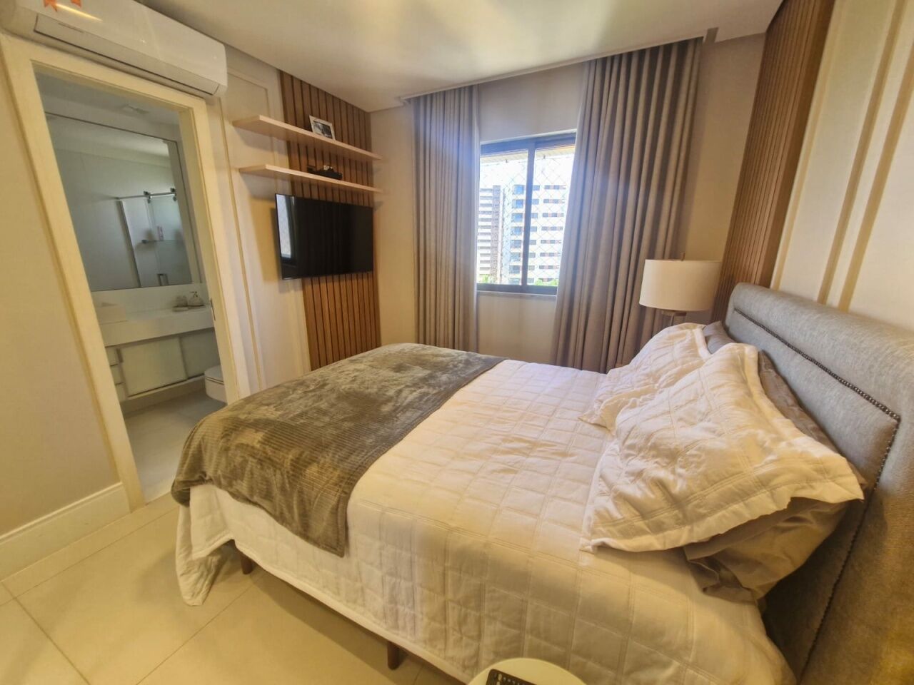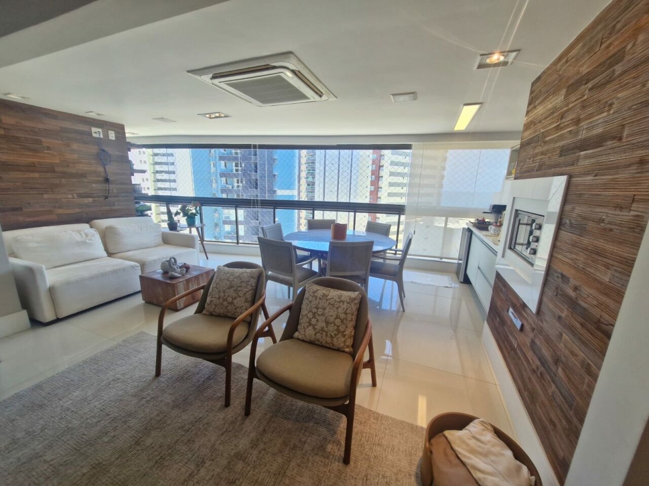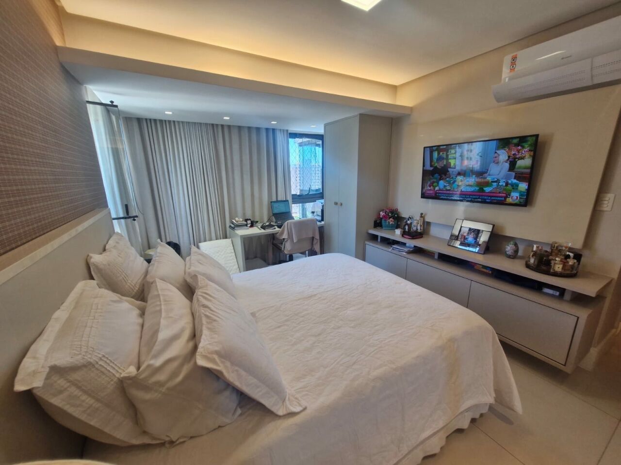 Excelente apartamento, nascente, fino acabamento, de 147m², originalmente com 4 quartos, revertidos pra 3 suítes, piso frio, varanda gourmet integrada com churrsqueira e fechamento em reiki, living amplo, projeto de iluminação, teto rebaixado, lavabo, sala de estar, sala de jantar, armários planejados em todos os cômodos, ar condicionado, cozinha espaçosa, área de serviço, dependencia completa, andar alto, vista mar, e três vagas de garagem.