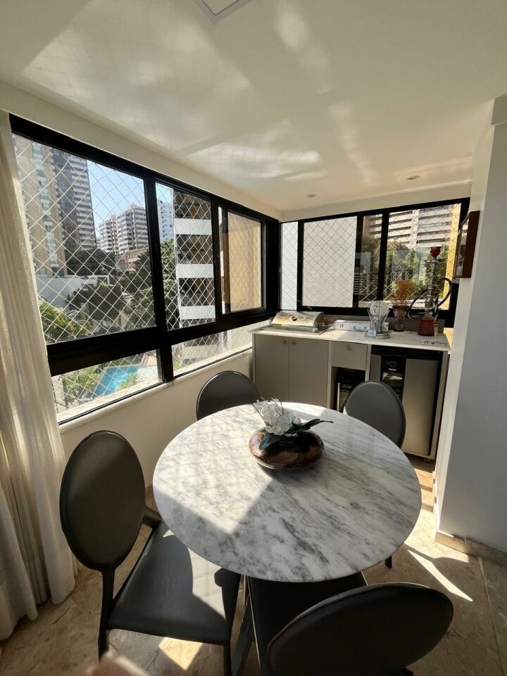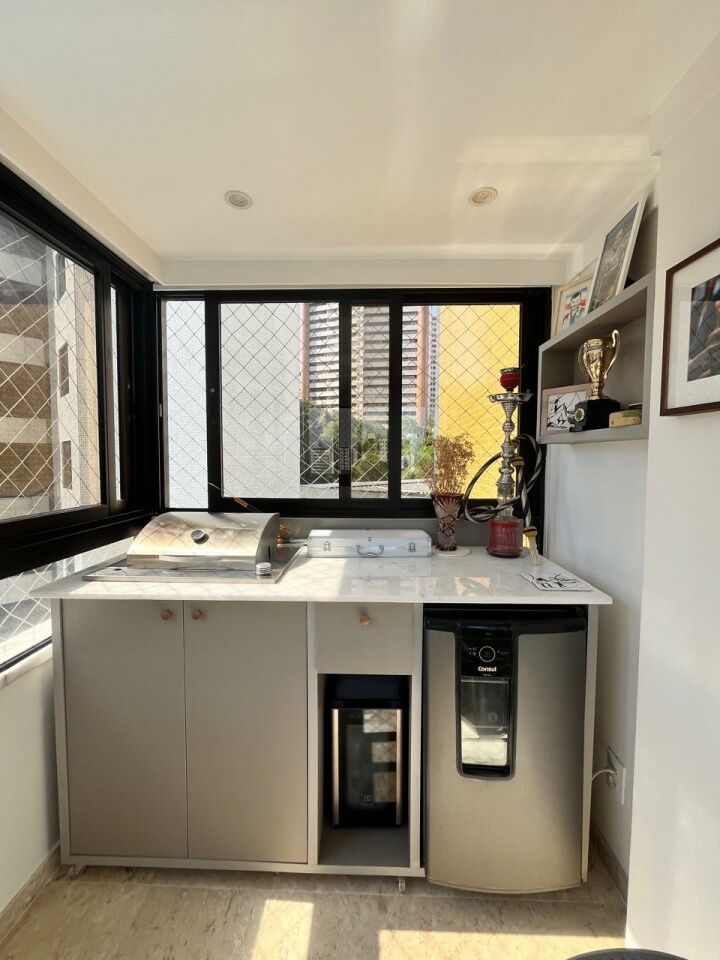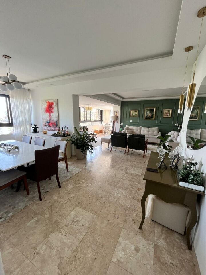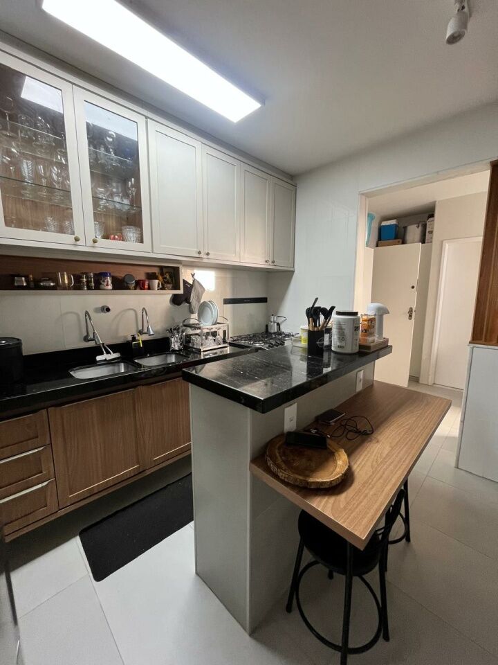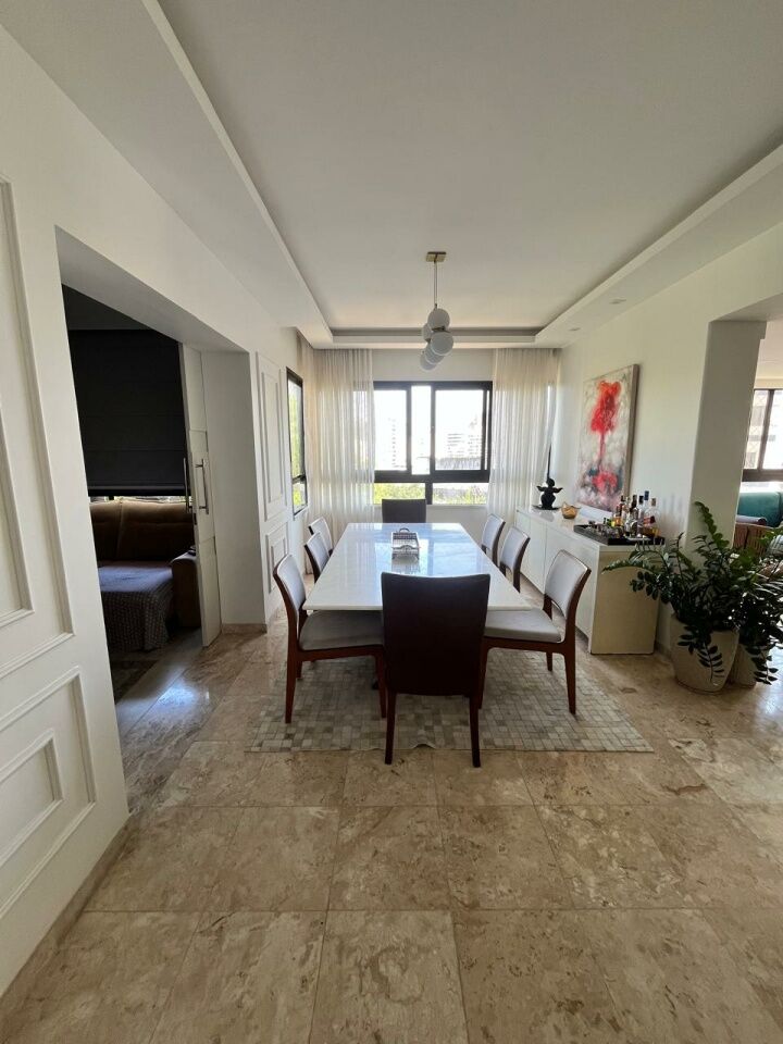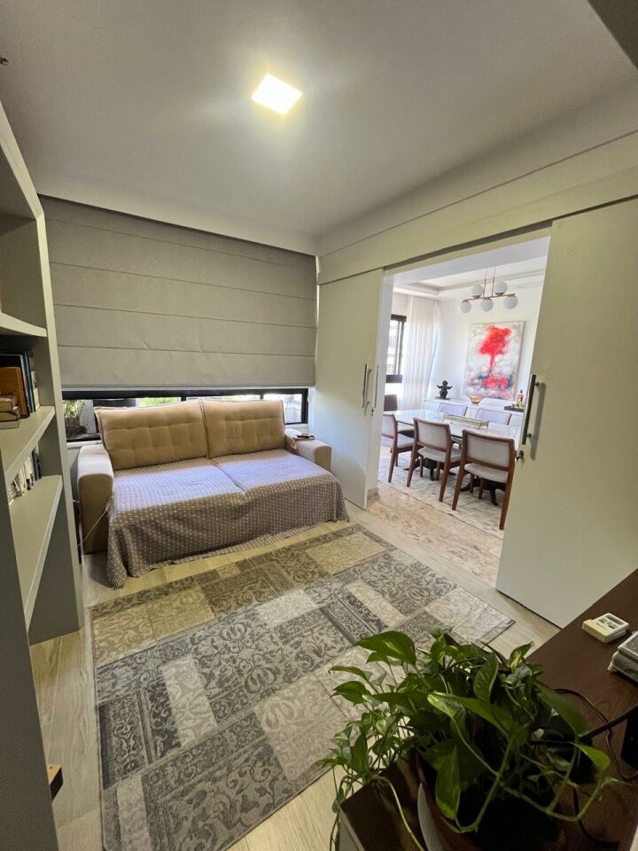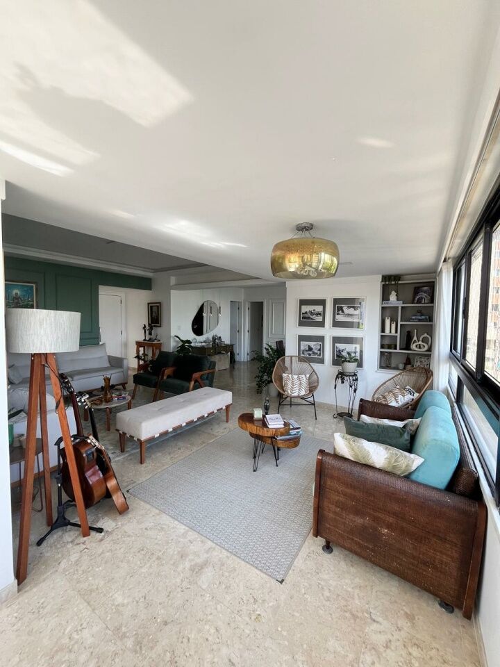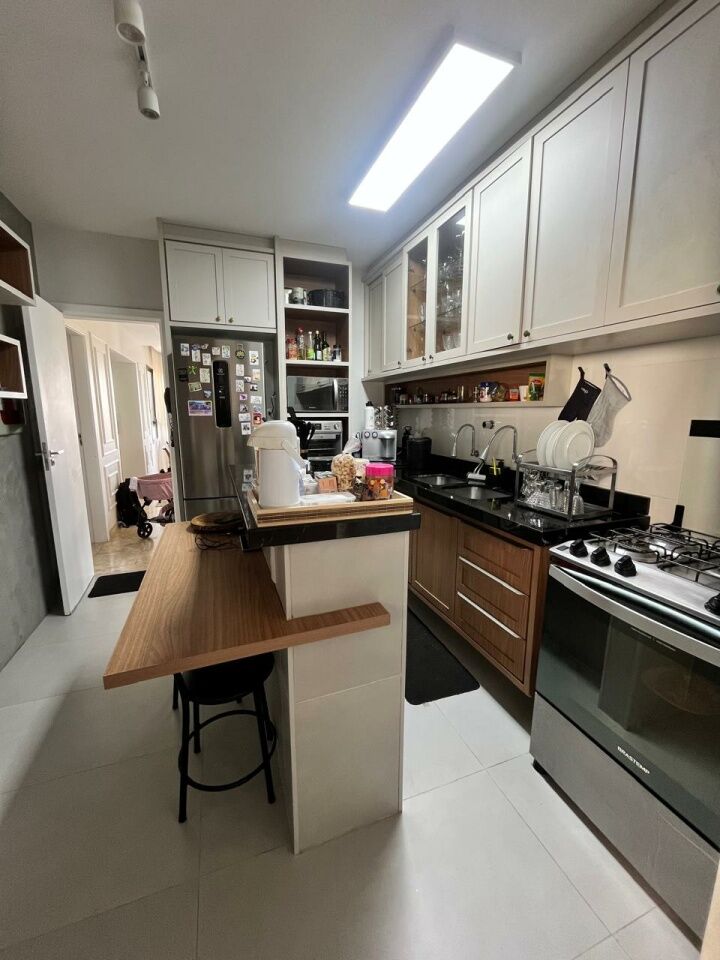 Excelente apartamento, totalmente reformado, fino acabamento, com 200m², 4 quartos, revertidos pra 3 quartos, sendo 2 suítes, piso mármore bege Bahia em toda sala, gabinete, varanda incorporada com bancada gourmet e com fechamento em reiki, living amplo, sala de estar, sala de jantar, lavabo, armários planejados em todos os cômodos, projeto de iluminação, teto com rebaixamento em gesso, ar condicionado, cozinha espaçosa, dependência completa, área de serviço, andar intermediário, e três vagas de garagem.
