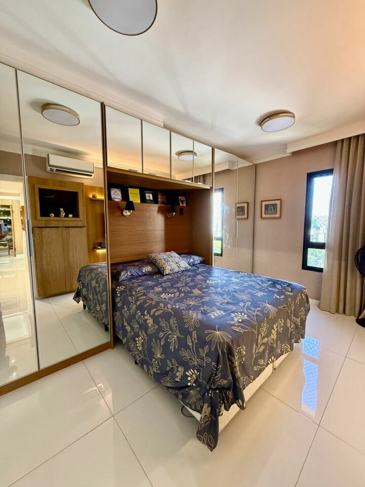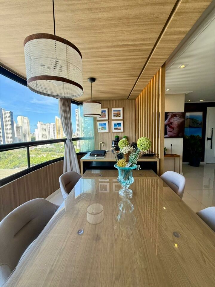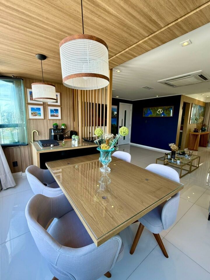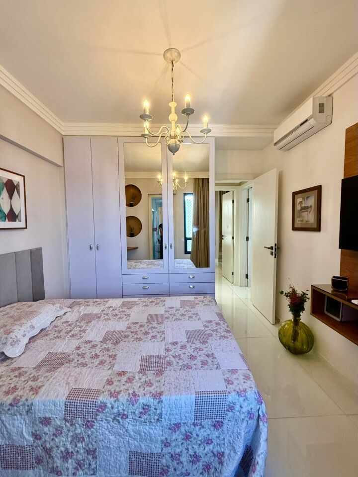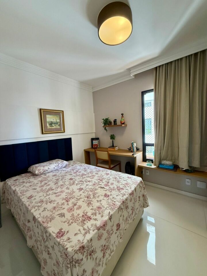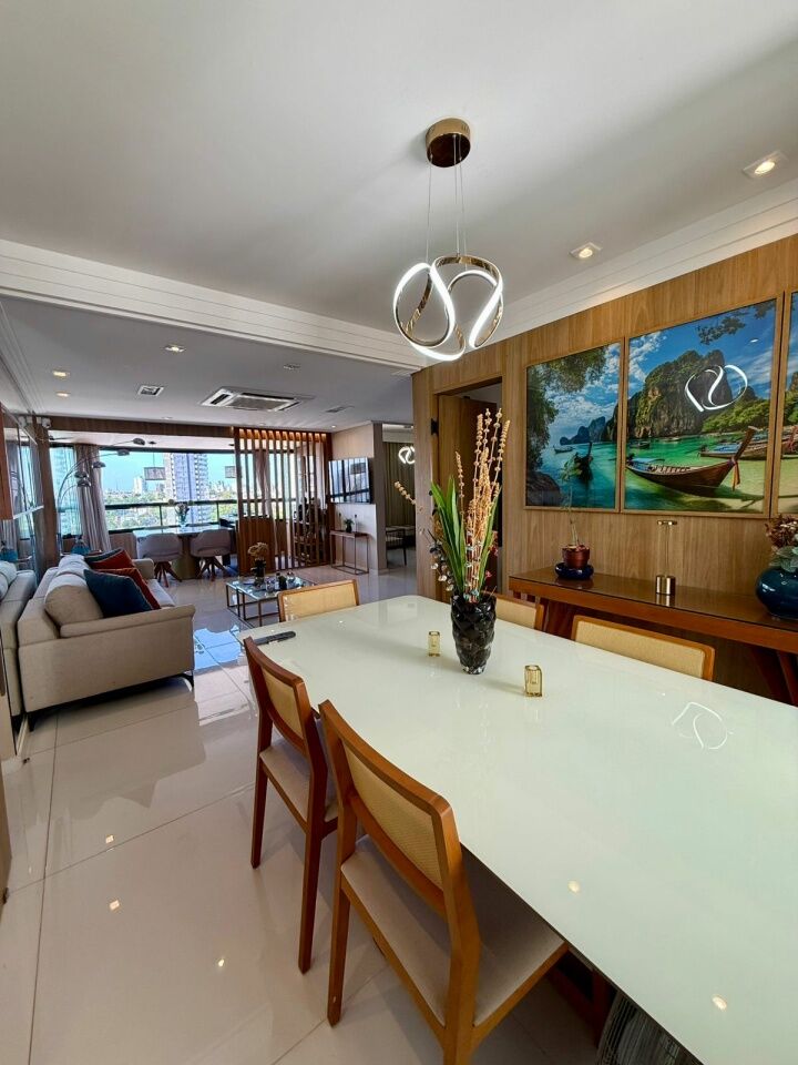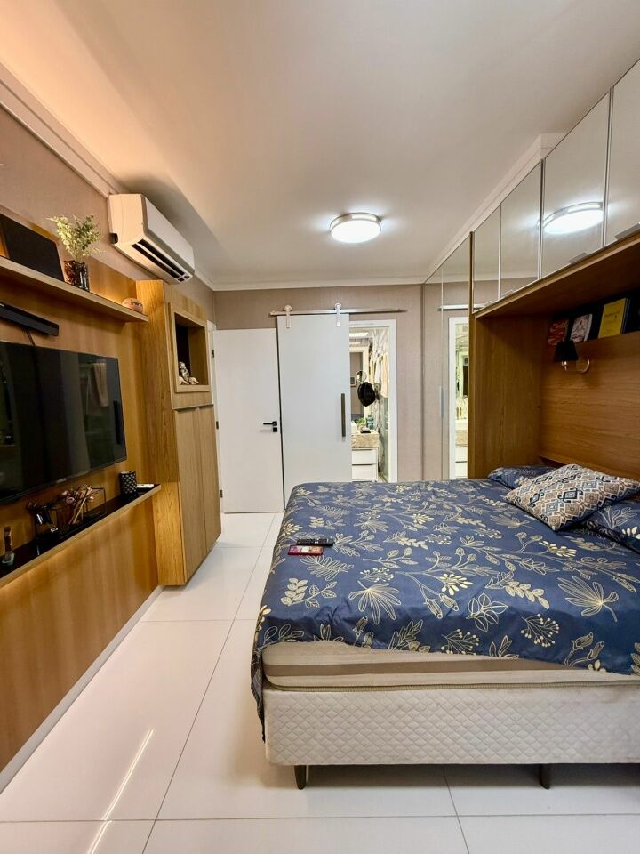 Excelente apartamento, porteira fechada, finamente decorado, de 126m², 3 quartos, 3 suítes, piso frio, home office, home teather, varanda gourmet incorporada com fechamento em reiki, dining room, living room, lavabo, armários planejados em todos os cômodos, ambientes climatizados, projeto de iluminação com teto rebaixado, cozinha espaçosa, dependência, área de serviço, andar intermediário, e três vagas de garagem.