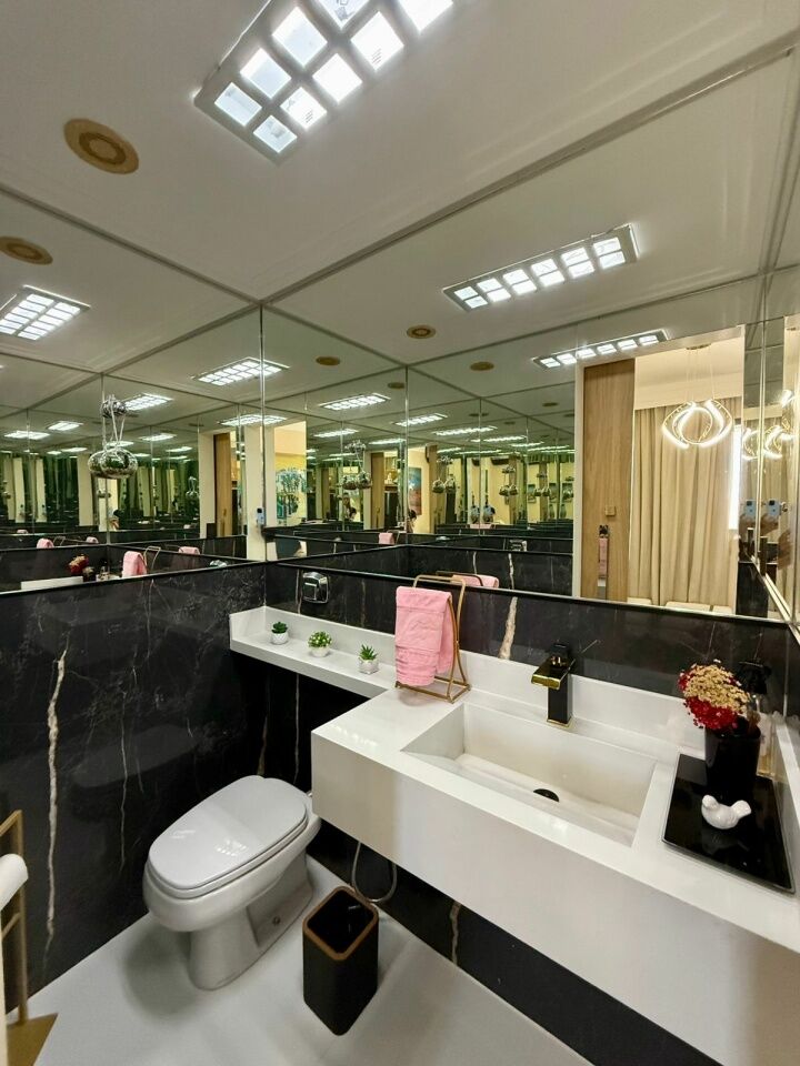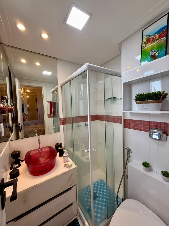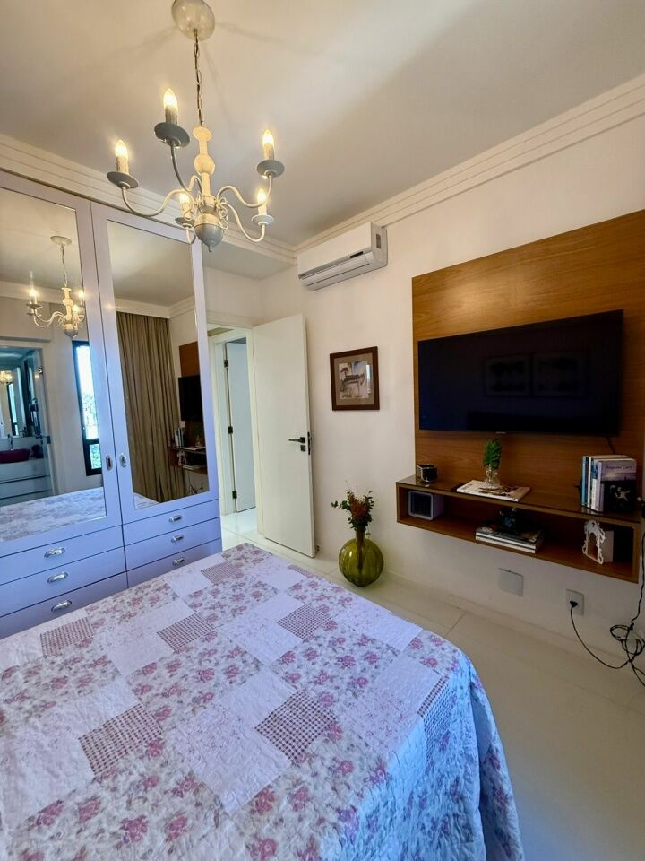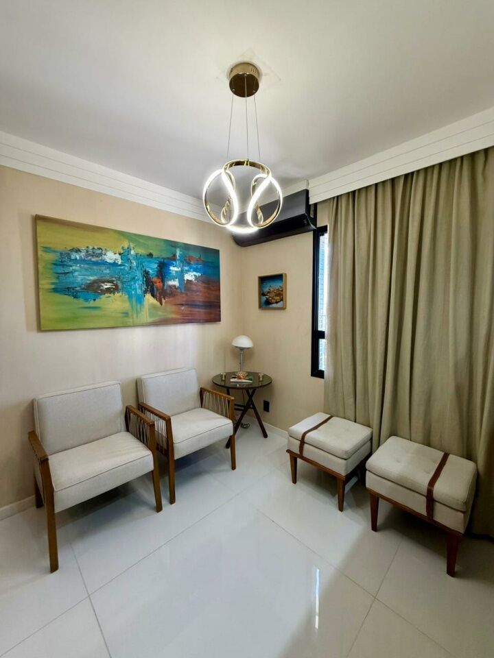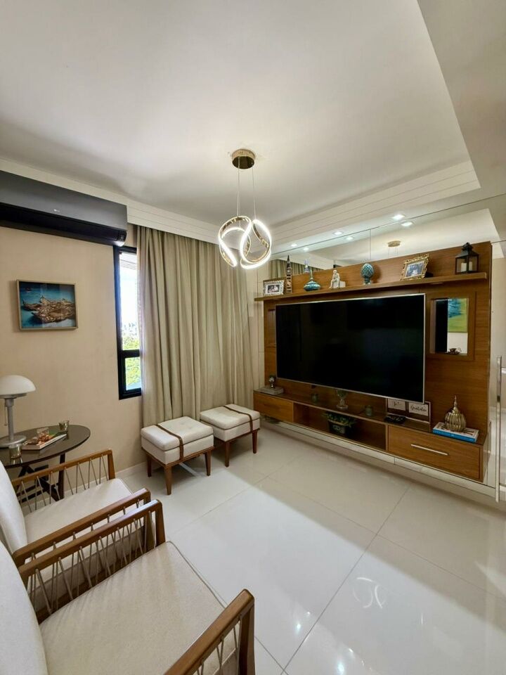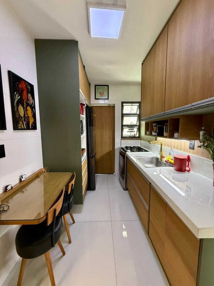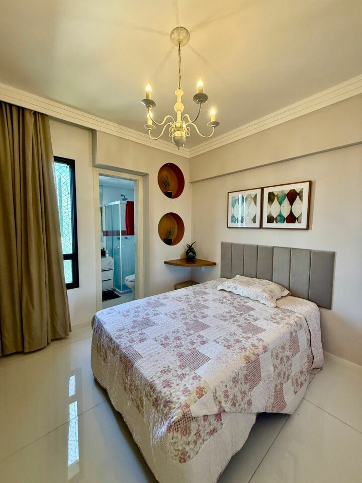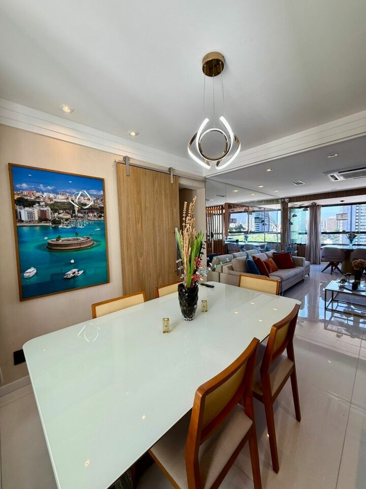 Excelente apartamento, porteira fechada, finamente decorado, de 126m², 3 quartos, 3 suítes, piso frio, home office, home teather, varanda gourmet incorporada com fechamento em reiki, dining room, living room, lavabo, armários planejados em todos os cômodos, ambientes climatizados, projeto de iluminação com teto rebaixado, cozinha espaçosa, dependência, área de serviço, andar intermediário, e três vagas de garagem.