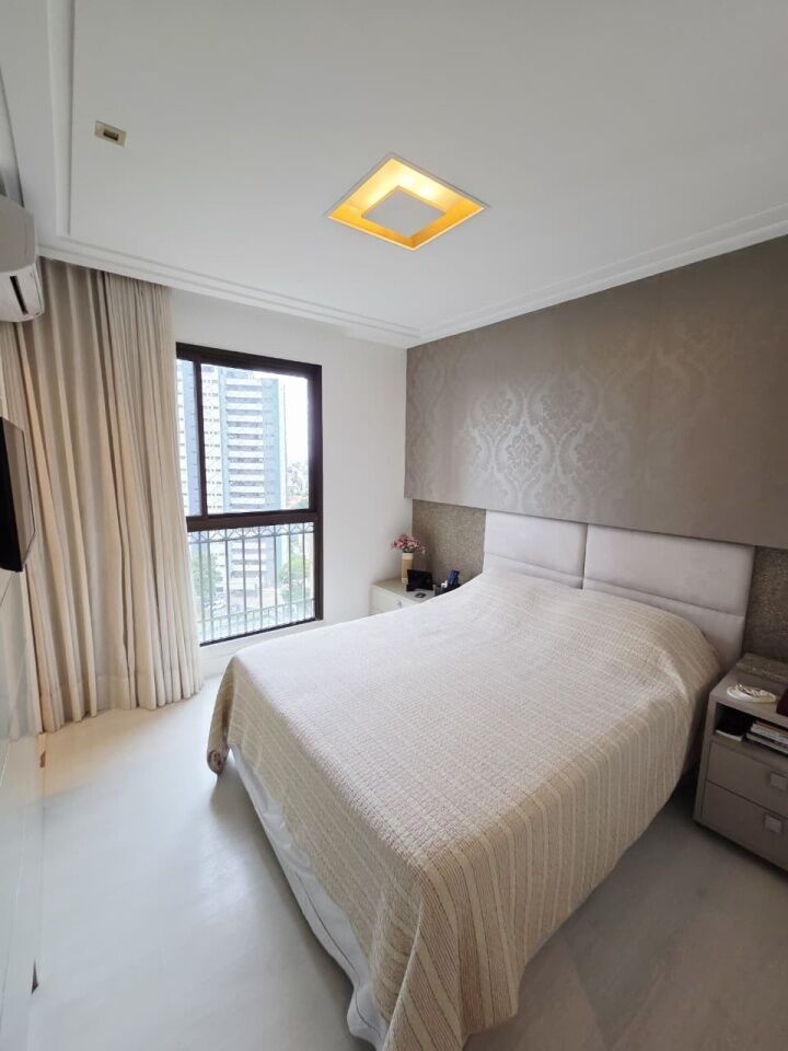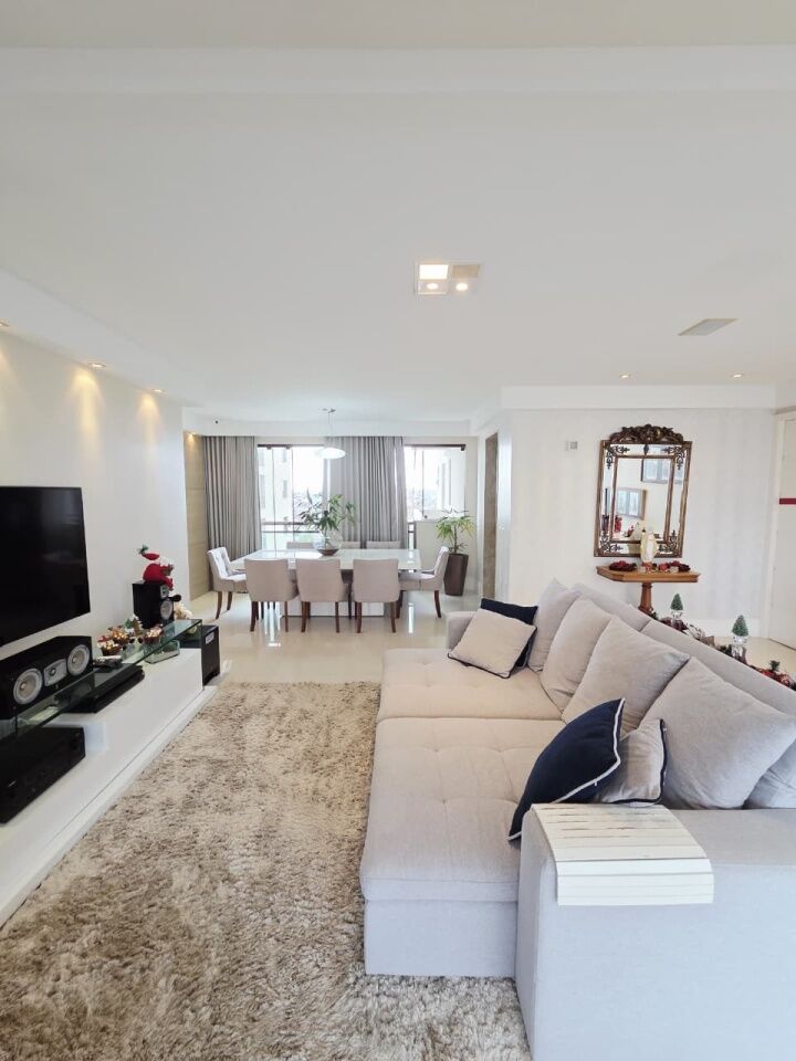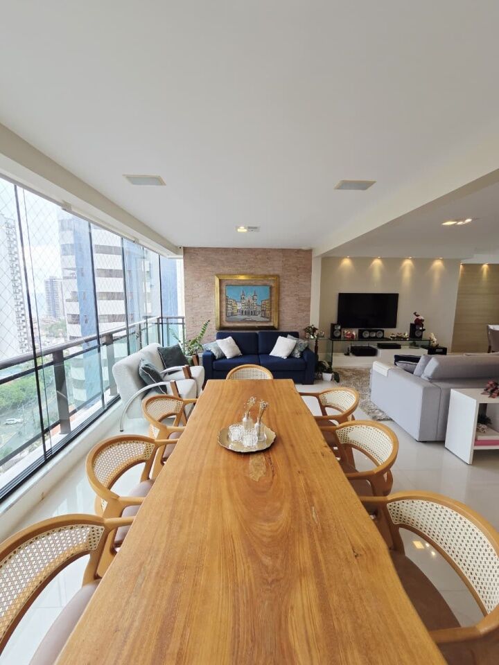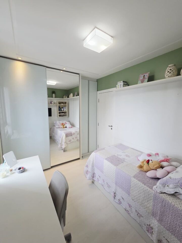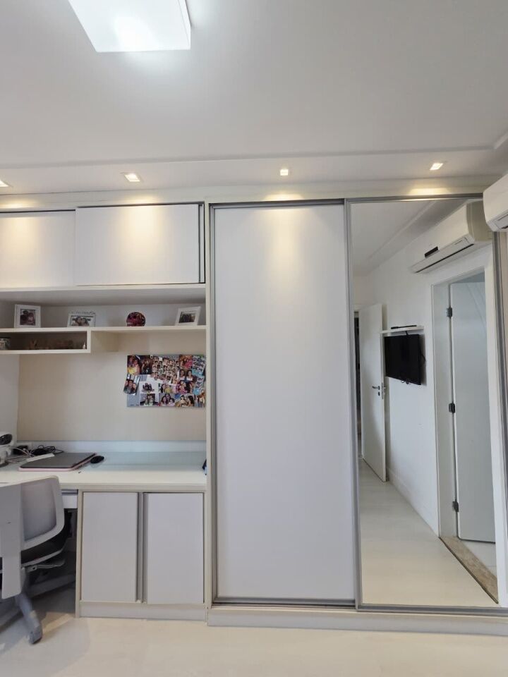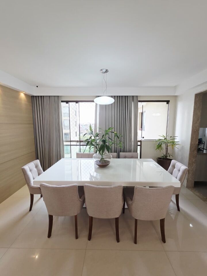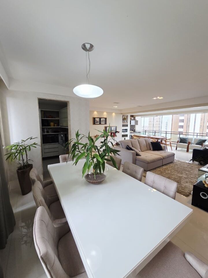Excelente apartamento, nascente, fino acabamento, 149m², com 3 quartos, 3 suítes, varanda gourmet incorporada com fechamento em reiki, closet, gabinete, living amplo, sala de estar, sala de jantar, lavabo, armários planejados em todos os cômodos, projeto de iluminação, ar condicionado, cozinha espaçosa, dependência completa, área de serviço, e três vagas de garagem.