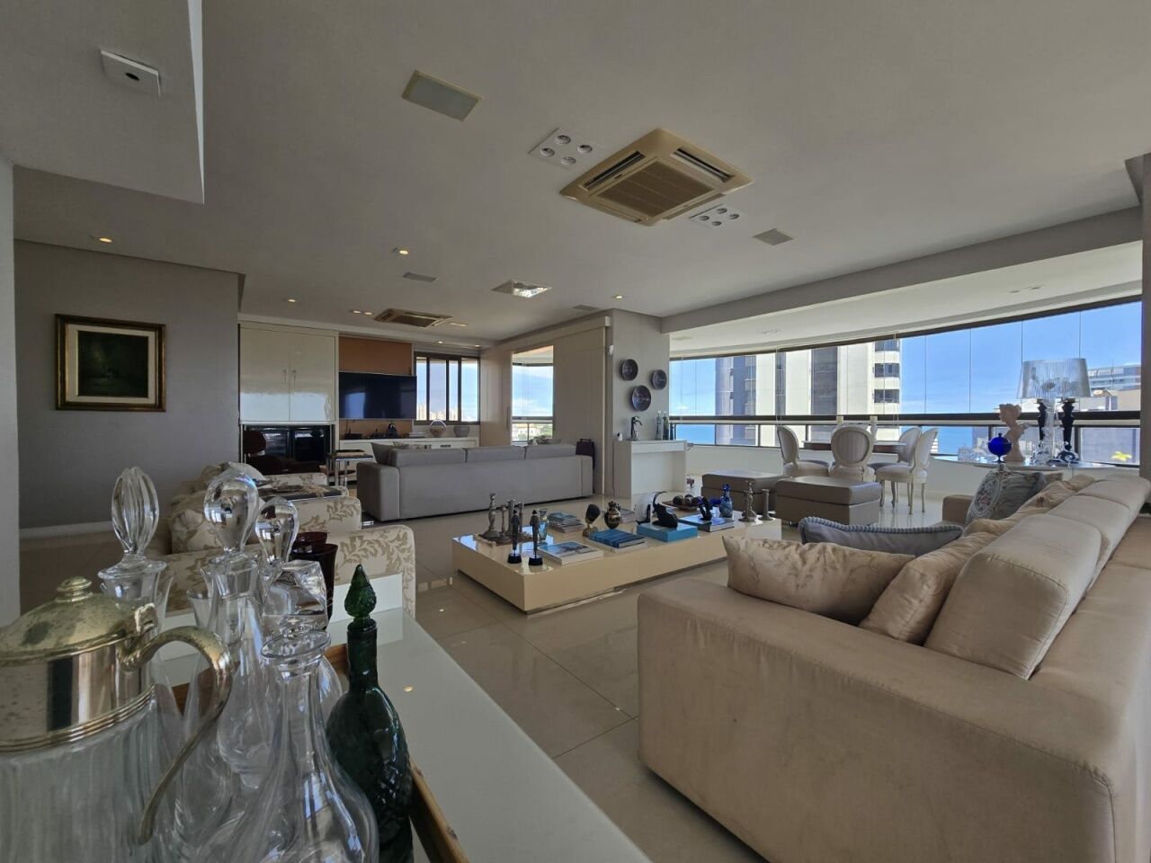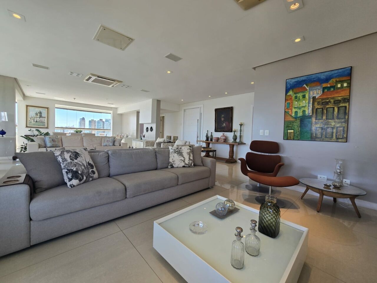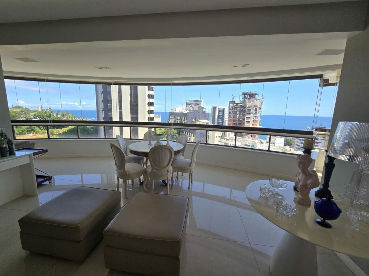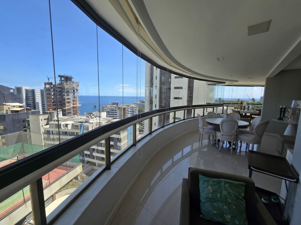 Maravilhoso apartamento originalmente 4 quartos, todos suítes, atualmente convertido para 3 suítes, sendo uma master com 2 closets e dois banheiros, 318m2 com acabamento alto luxo. Sala íntima com varanda com Reiki. Piso em Marmoglass. Amplo living com vista panorâmica deslumbrante do Rio Vermelho até Ilha de Itaparica. Living com varanda incorporada com Reiki e cortinas Luxaflex. Todo climatizado com Splits. Projeto de iluminação e sonorização. Armários em todos os ambientes da Kitchens. Possui Copa/Cozinha, 4 garagens soltas na G1 (pinturas de Bel Borba expostas nas garagens) e depósito na garagem.