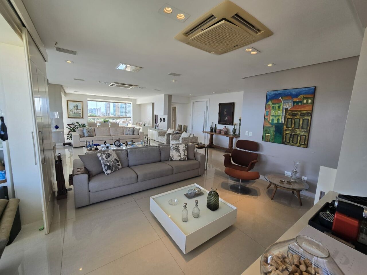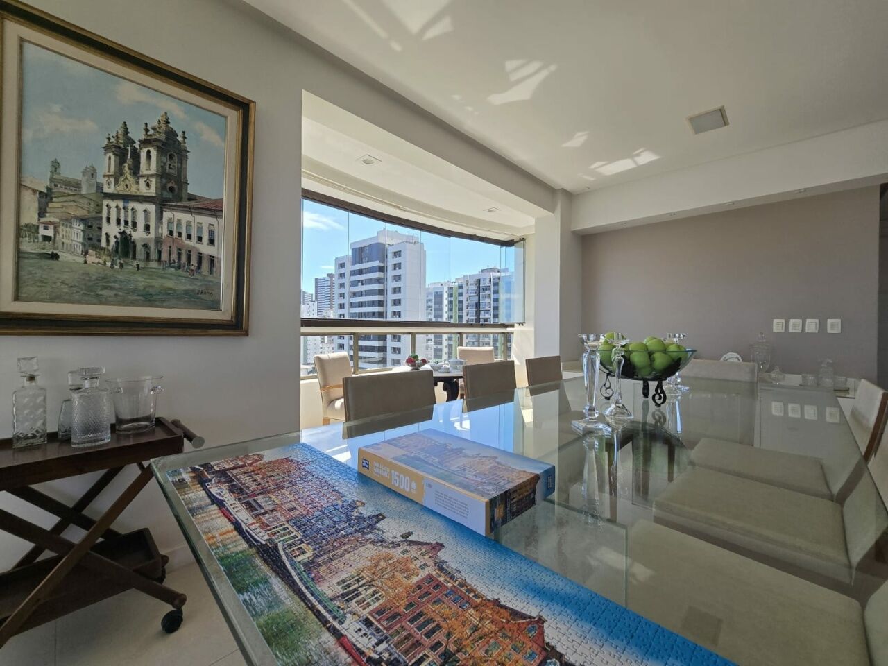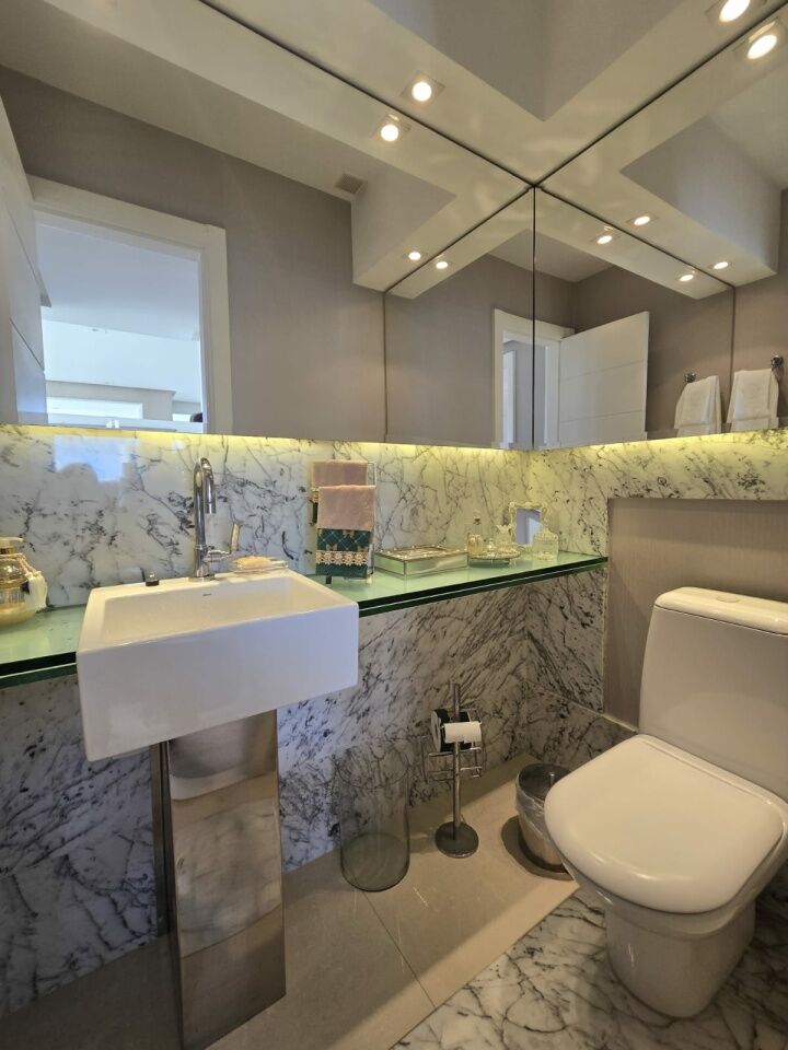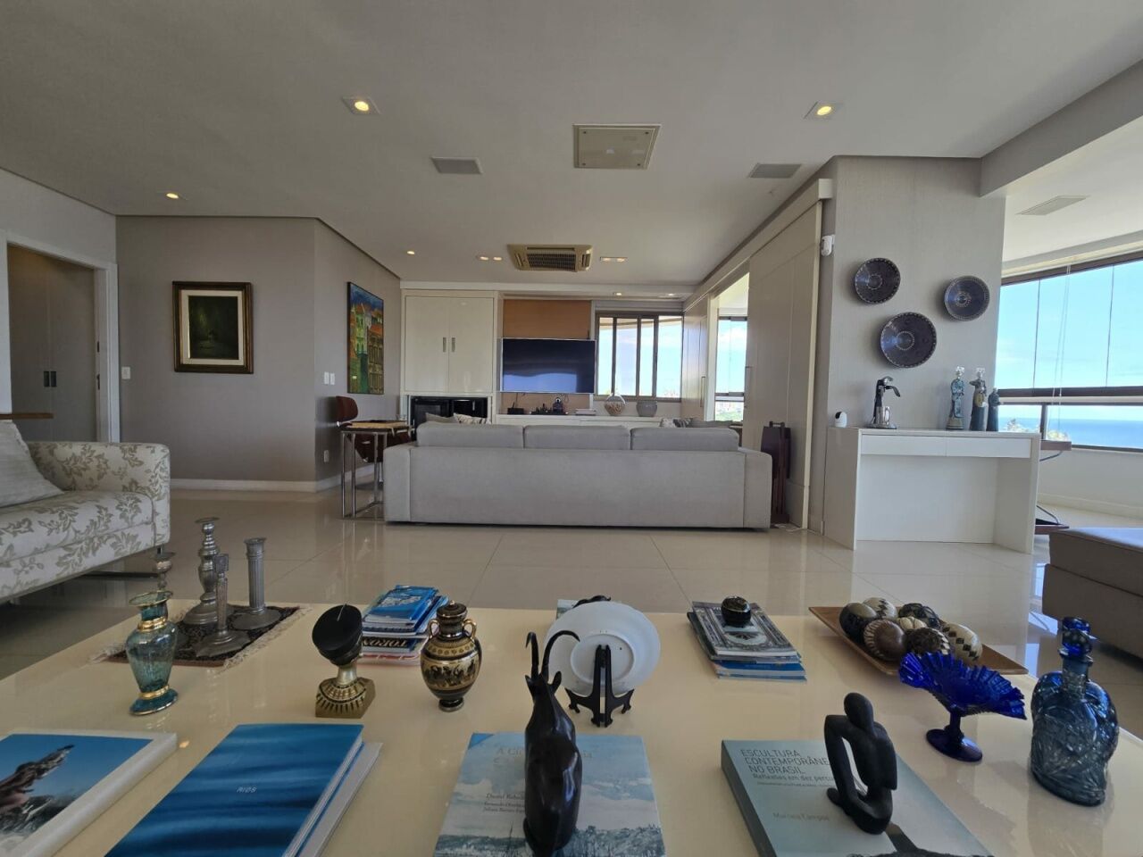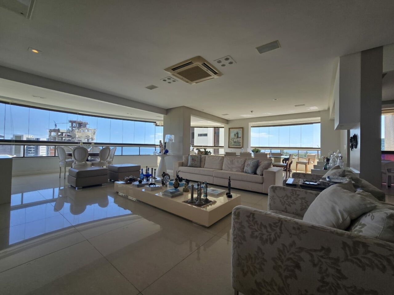 Maravilhoso apartamento originalmente 4 quartos, todos suítes, atualmente convertido para 3 suítes, sendo uma master com 2 closets e dois banheiros, 318m2 com acabamento alto luxo. Sala íntima com varanda com Reiki. Piso em Marmoglass. Amplo living com vista panorâmica deslumbrante do Rio Vermelho até Ilha de Itaparica. Living com varanda incorporada com Reiki e cortinas Luxaflex. Todo climatizado com Splits. Projeto de iluminação e sonorização. Armários em todos os ambientes da Kitchens. Possui Copa/Cozinha, 4 garagens soltas na G1 (pinturas de Bel Borba expostas nas garagens) e depósito na garagem.