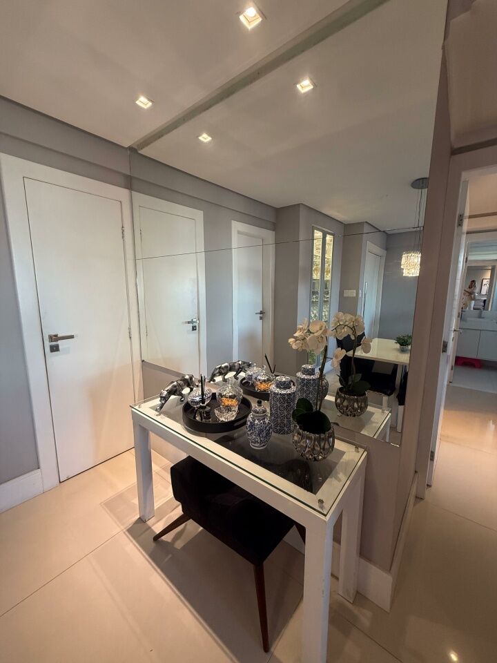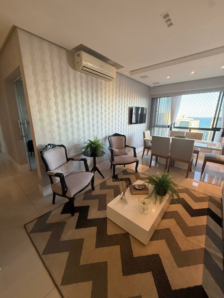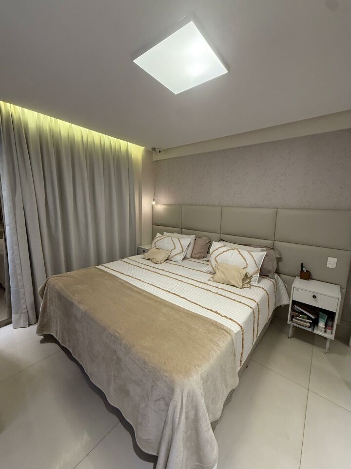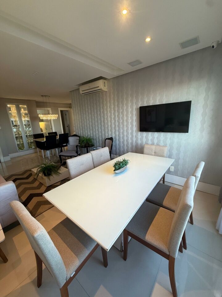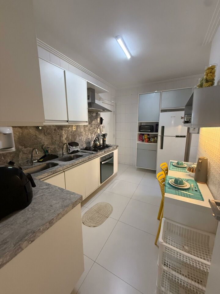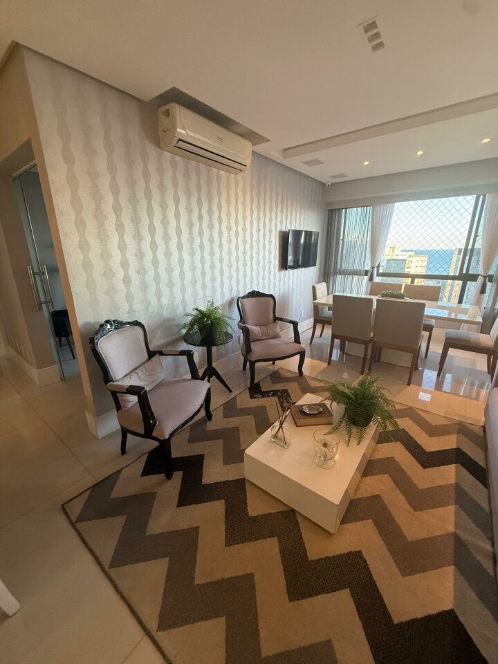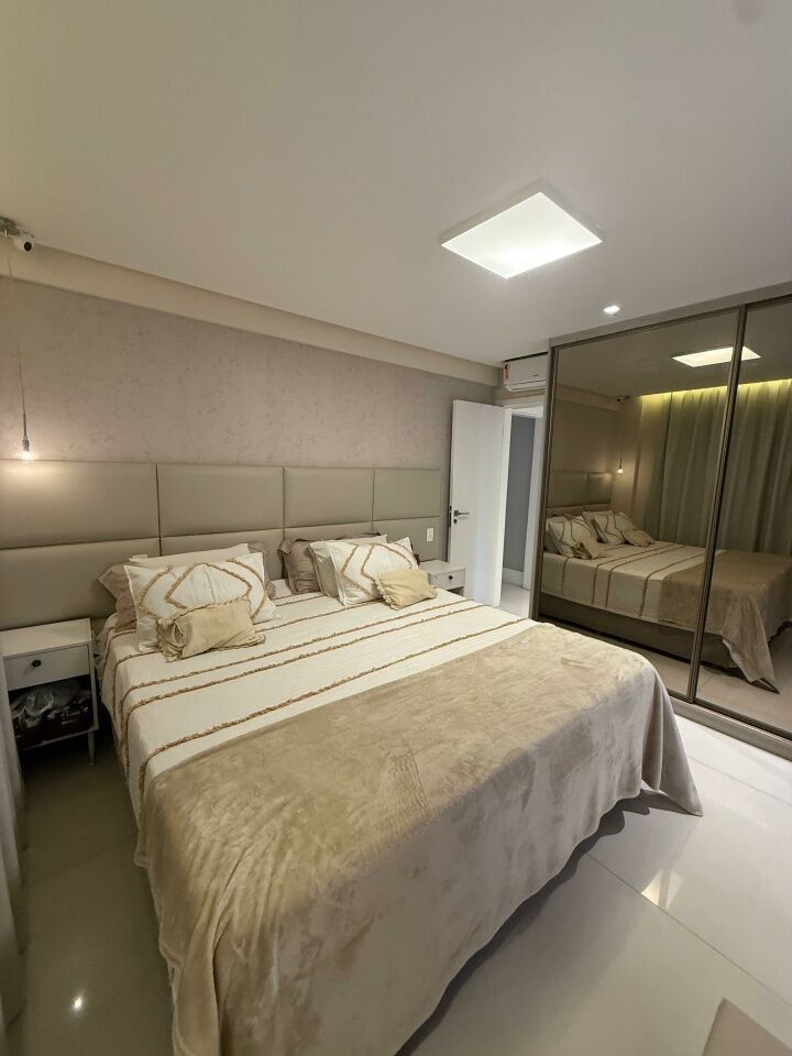 Excelente apartamento, nascente, finamente decorado, de 120m², com 4 quartos, 3 suítes, piso frio, varanda incorporada com fechamento em reiki, sala de estar, sala de jantar, living amplo, lavabo, armários planejados em todos os cômodos, ambientes climatizados, cozinha espaçosa, área de serviço, dependência completa, andar alto, vista mar, e duas vagas de garagem.