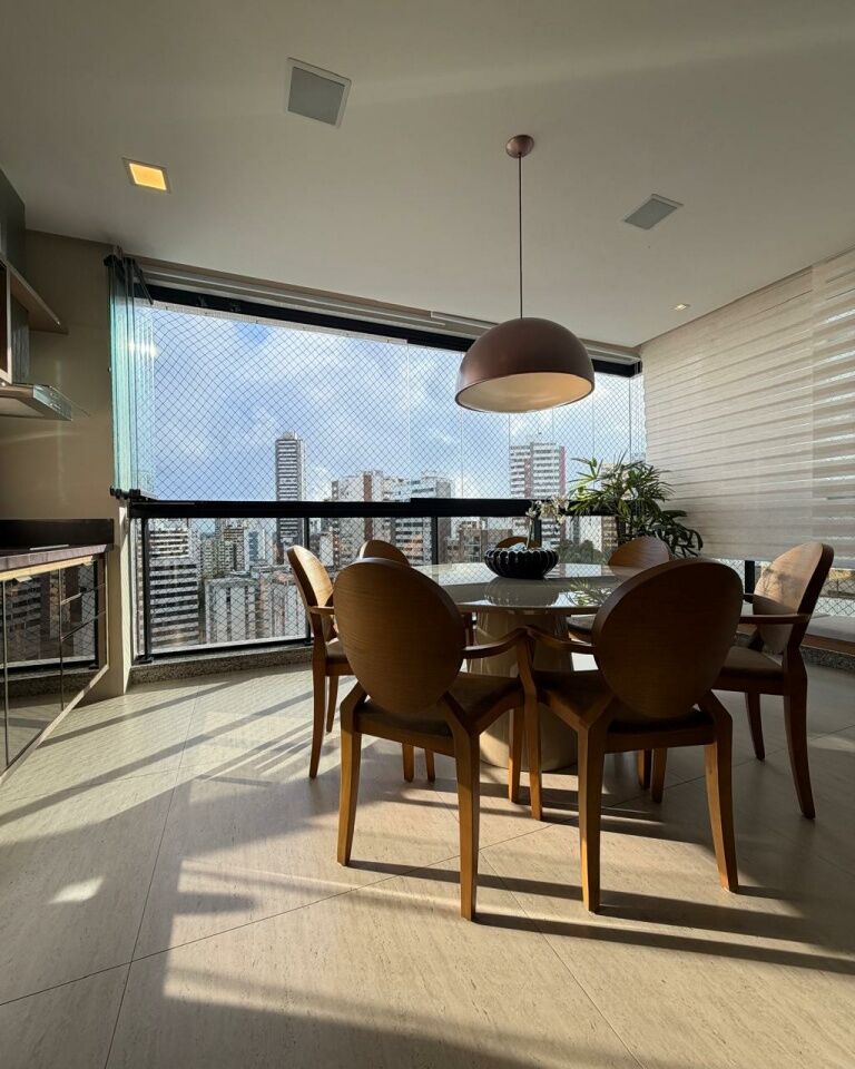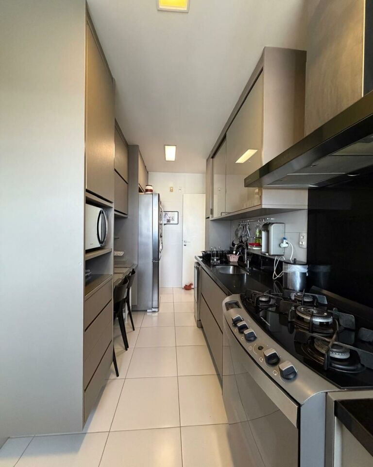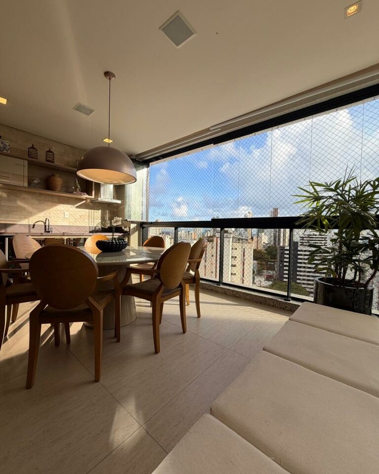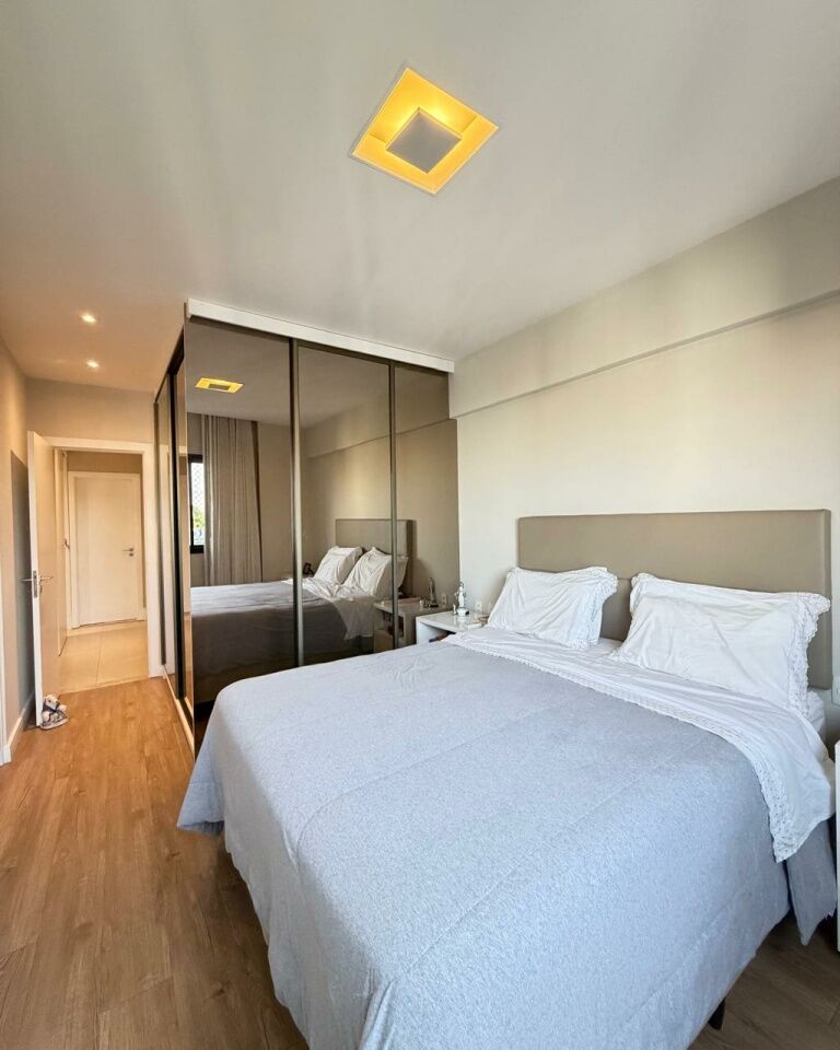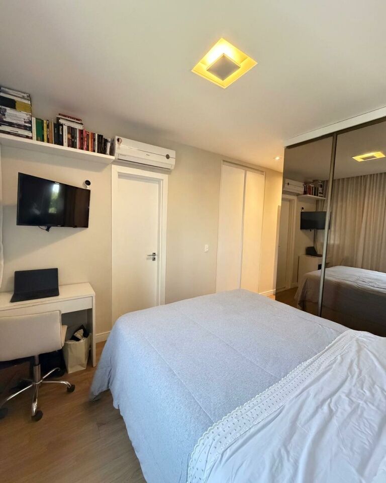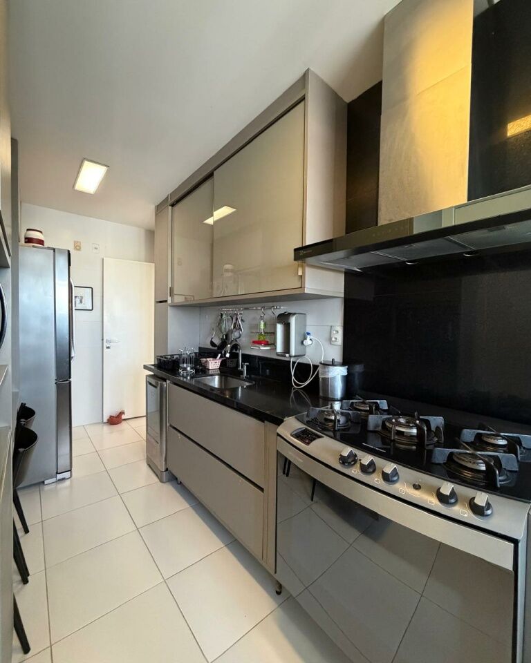 Excelente apartamento, fino acabamento, de 127m², com 3 quartos, 3 suítes, closet, piso frio, varanda gourmet incorporada a sala com fechamento em reiki, sala de jantar, sala de estar, living amplo, lavabo, armários em todos os cômodos, ar condicionado, teto rebaixado com projeto de iluminação, andar alto, área de serviço, dependência completa e três vagas de garagem cobertas mais depósito.