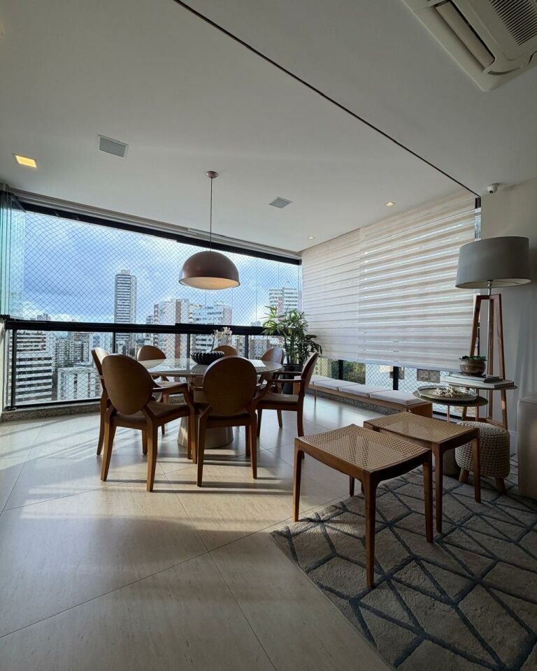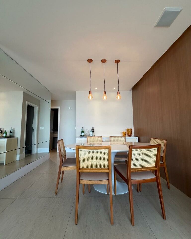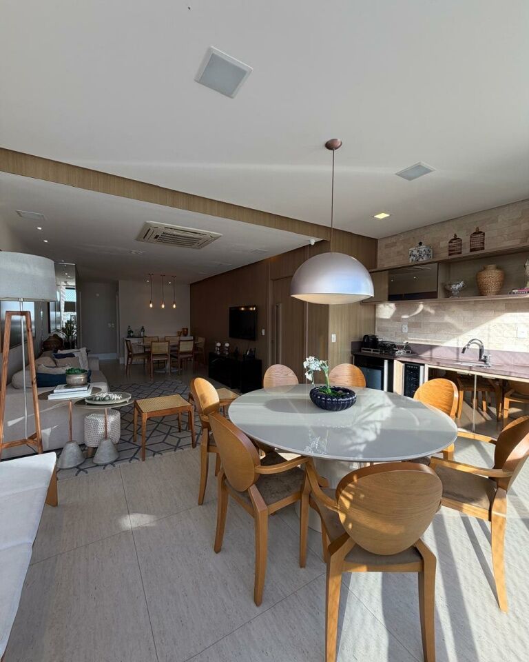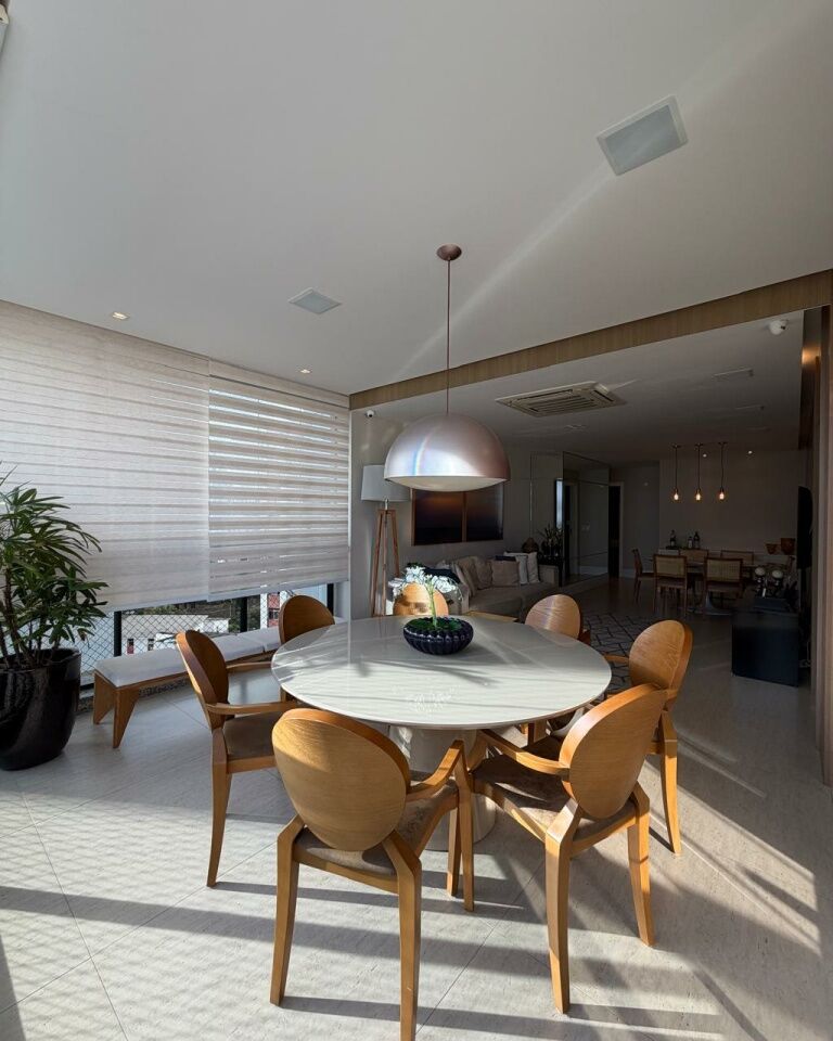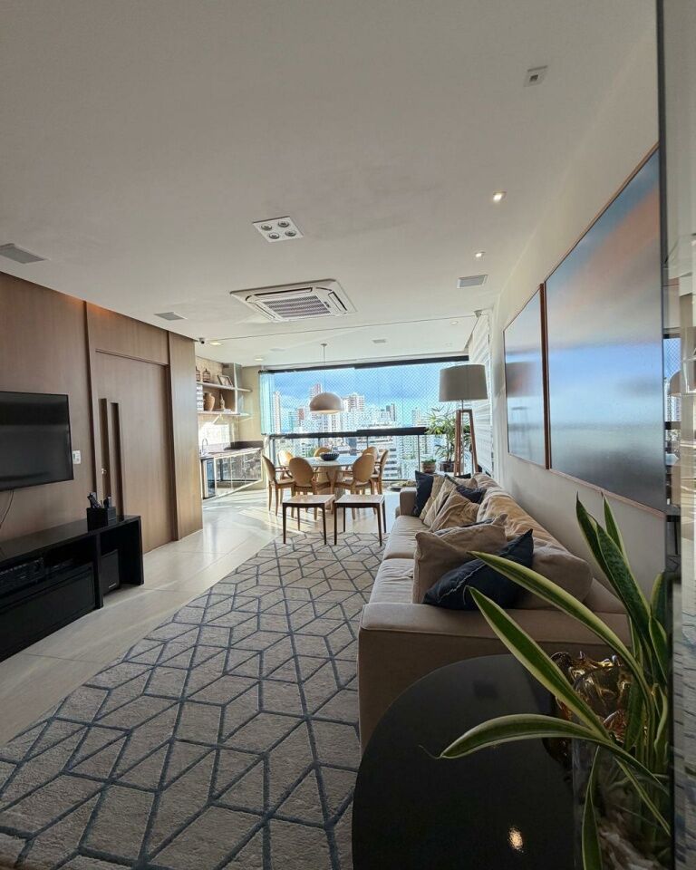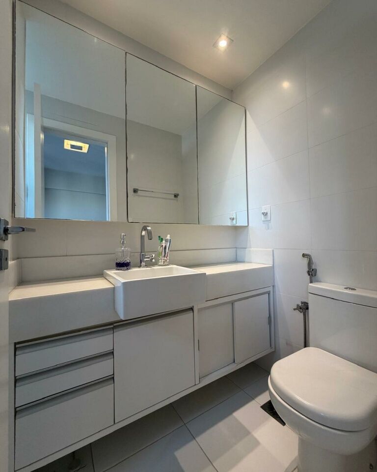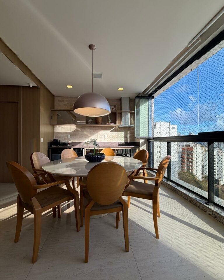 Excelente apartamento, fino acabamento, de 127m², com 3 quartos, 3 suítes, closet, piso frio, varanda gourmet incorporada a sala com fechamento em reiki, sala de jantar, sala de estar, living amplo, lavabo, armários em todos os cômodos, ar condicionado, teto rebaixado com projeto de iluminação, andar alto, área de serviço, dependência completa e três vagas de garagem cobertas mais depósito.