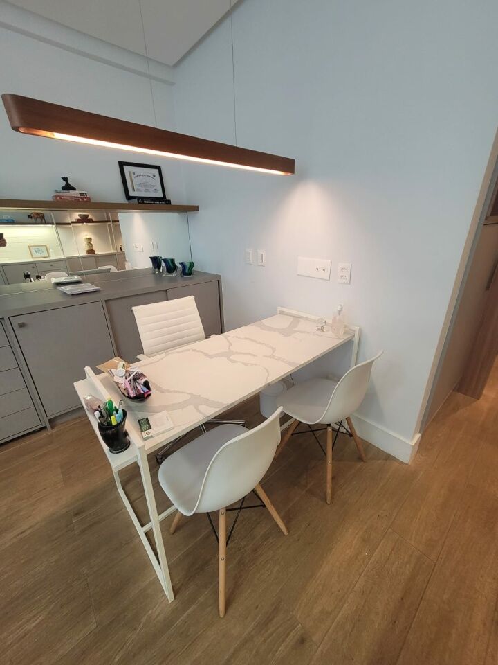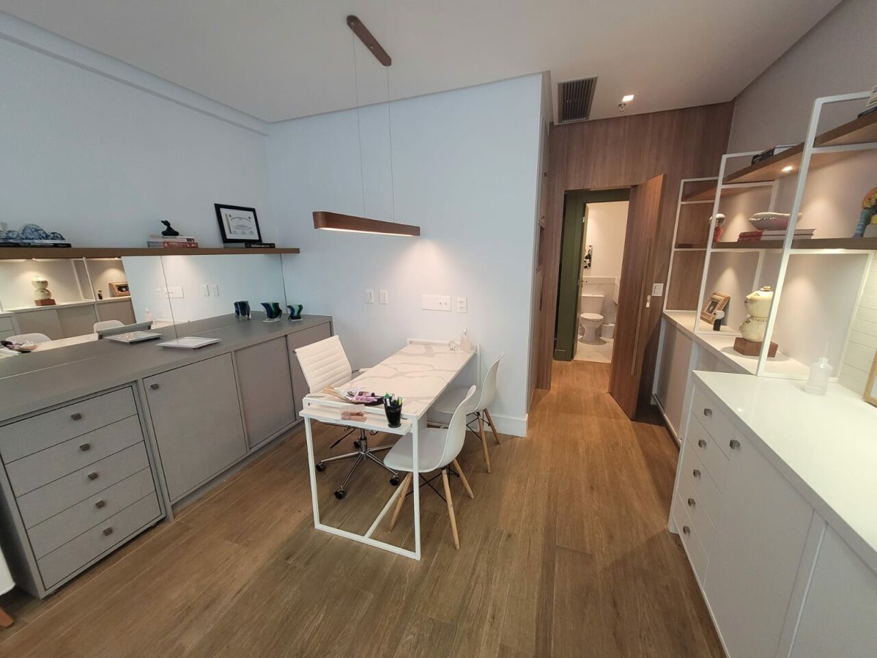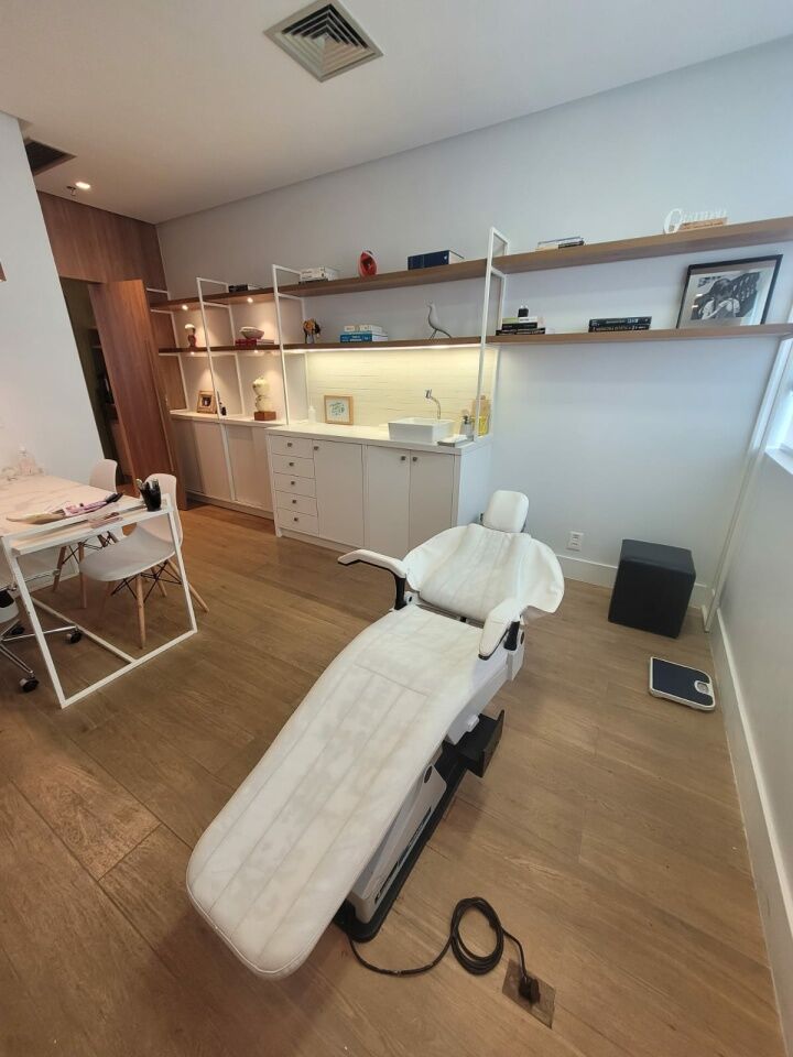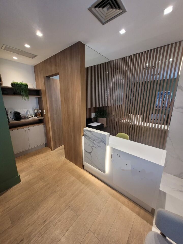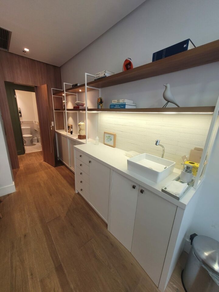 Excelente sala comercial finamente decorada, projeto de decoração e iluminação, com de 33m², com 1 banheiro, armários planejados em todo ambiente e uma vaga de garagem.