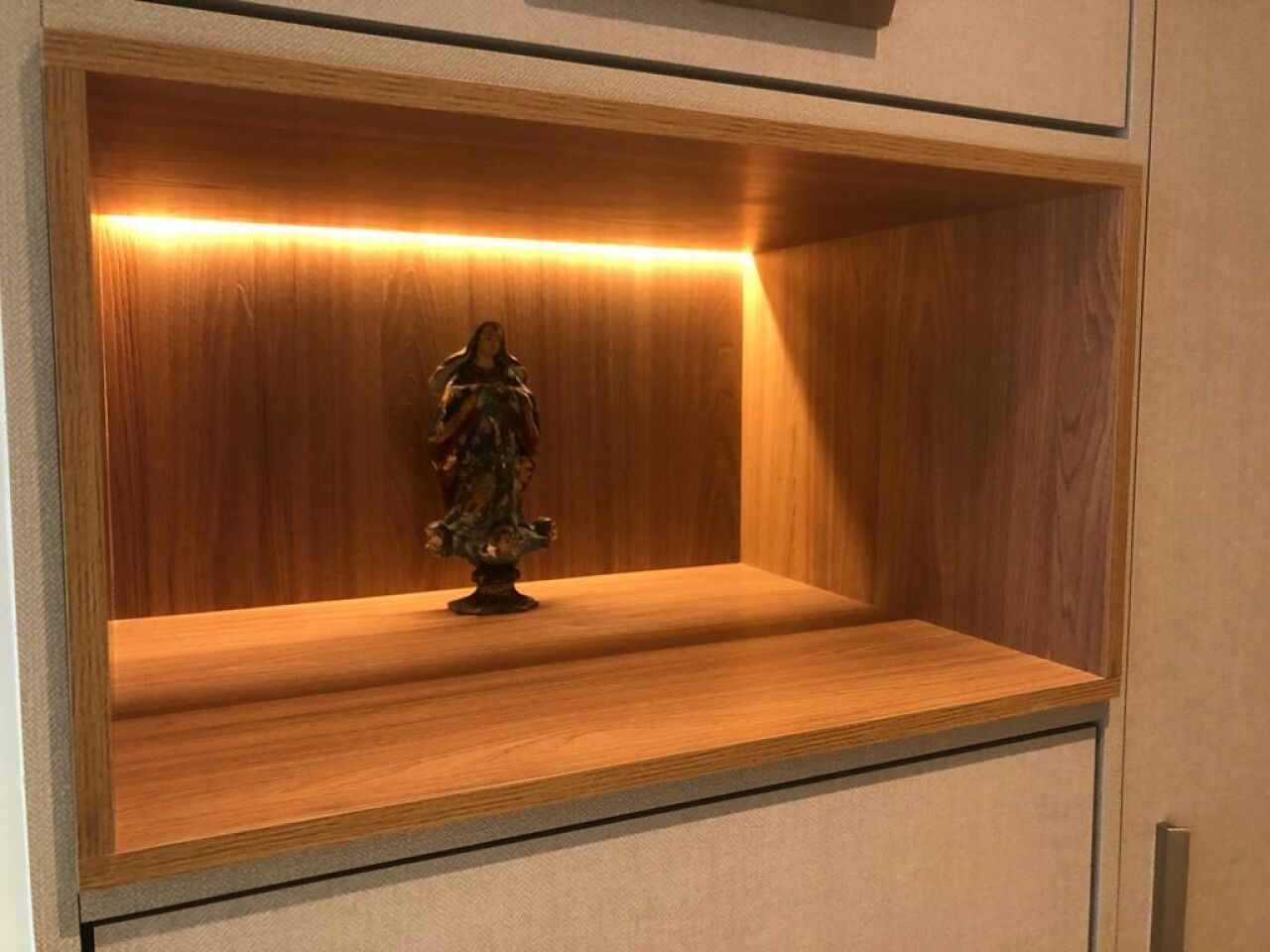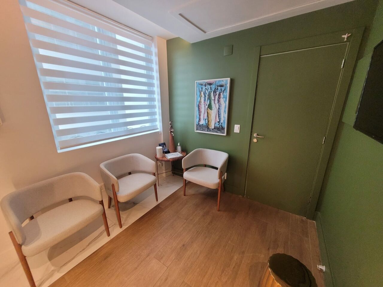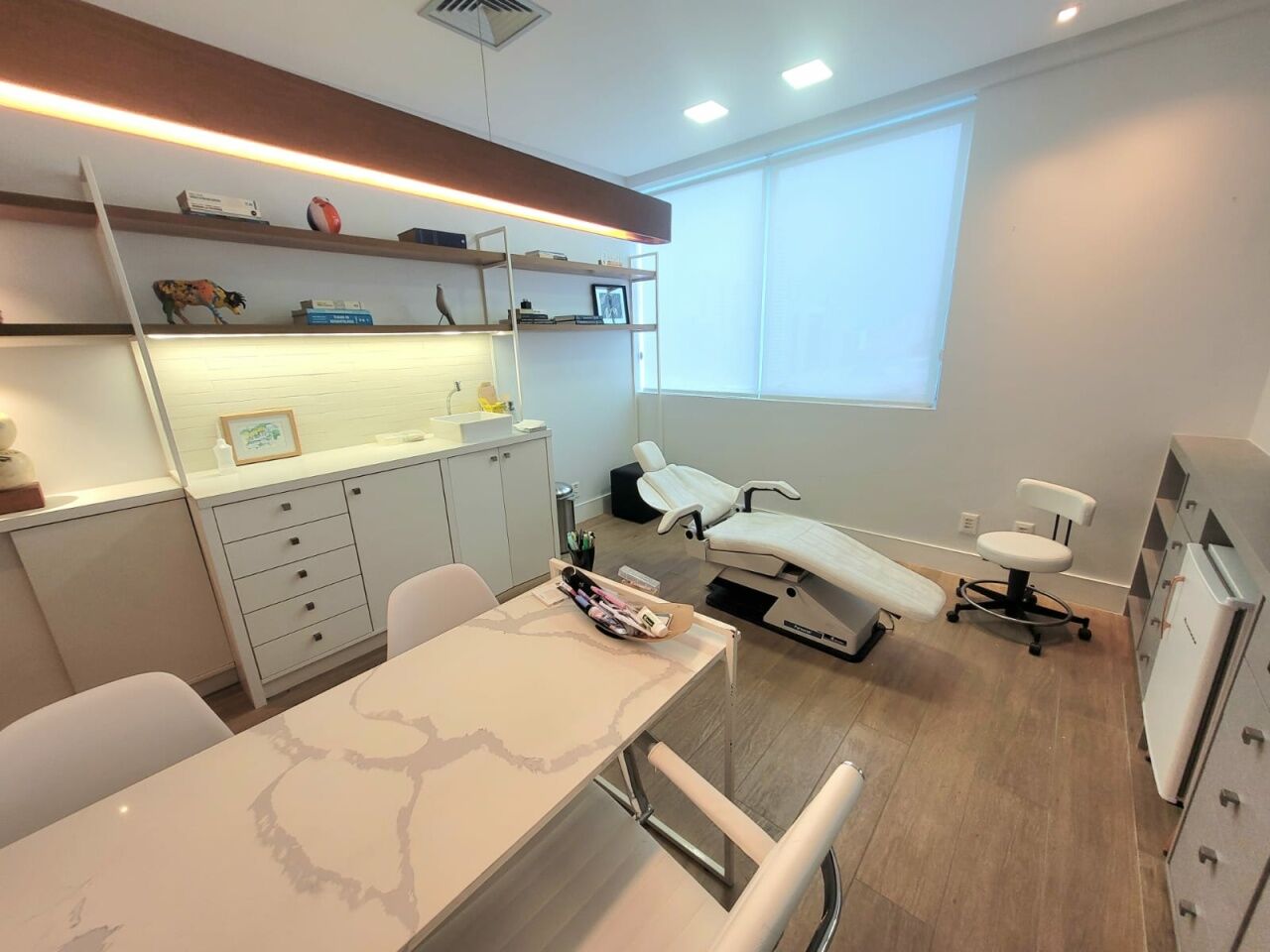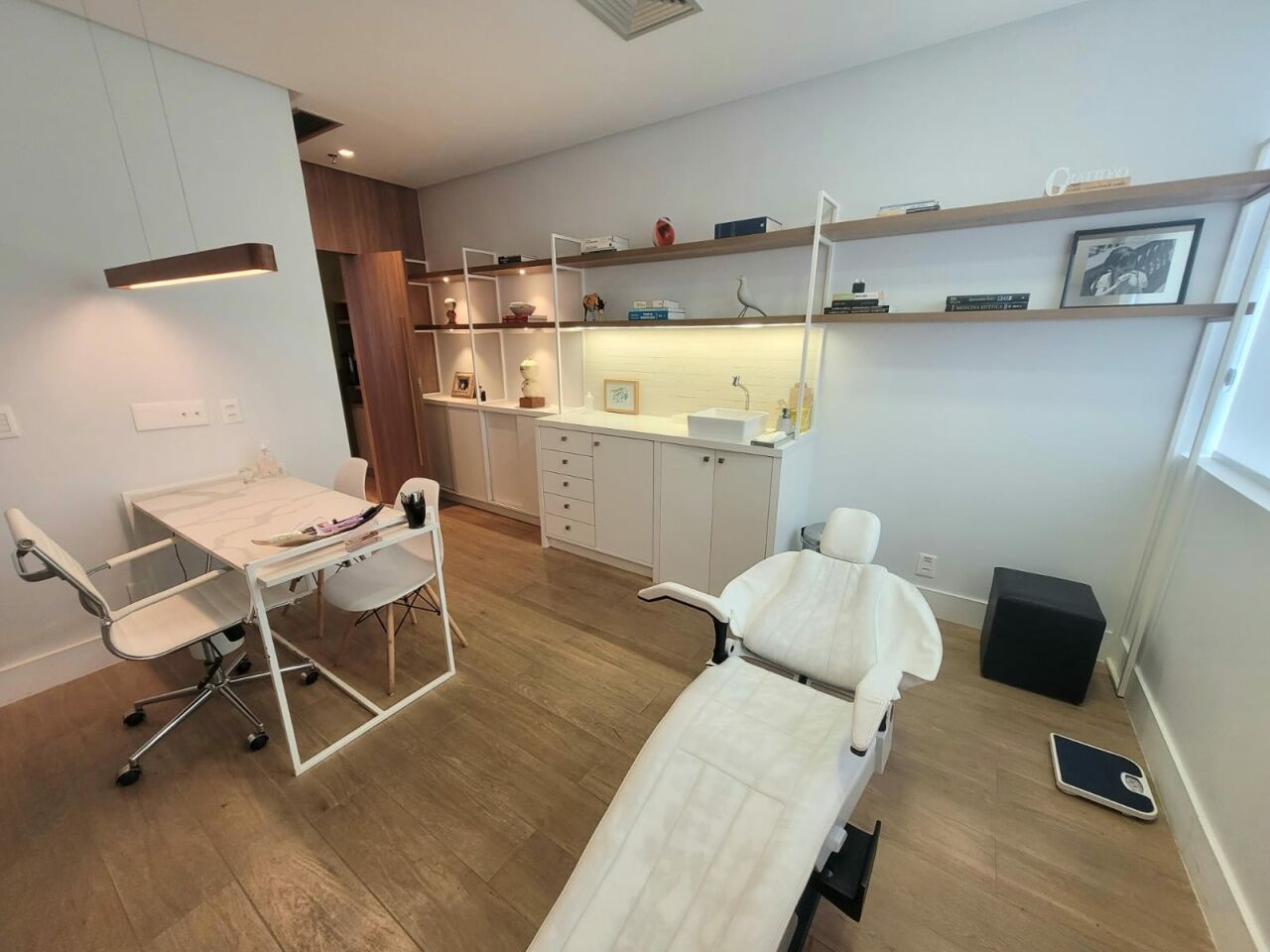 Excelente sala comercial finamente decorada, projeto de decoração e iluminação, com de 33m², com 1 banheiro, armários planejados em todo ambiente e uma vaga de garagem.